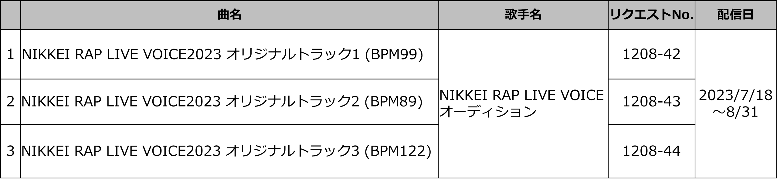 当社は、このコンテストの趣旨に賛同し「NIKKEI RAP LIVE VOICE」の応募用音源トラックをDAMに配信します。