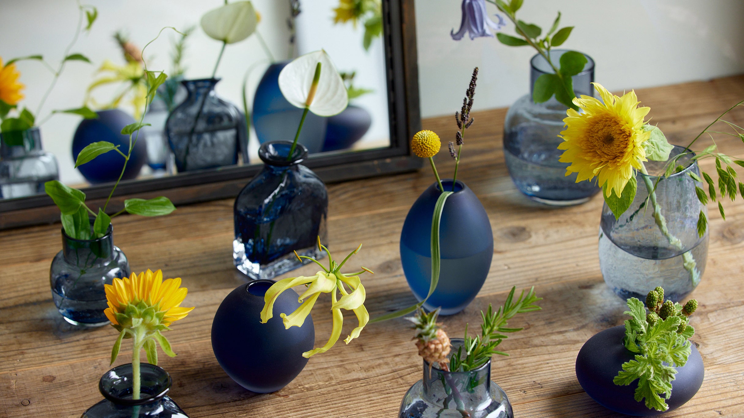 フローリストがセレクトしたフラワーベースがおよそ1,000種揃う、青山フラワーマーケット 南青山本店2階にある「フラワーベースギャラリー」。今回の青山ヒマワリ祭りに合わせて、ヒマワリカラーが映えるブルーのフラワーベースを集めて販売します。飾りやすい一輪挿しから、涼し気なガラスベースの他、春の青山バラ祭りで人気だった帽子型のフラワーベース「MOBJE(モブジェ)」からは青山フラワーマーケットの限定カラーが登場します。