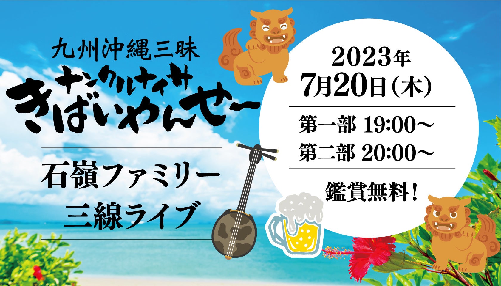 沖縄をまるごと楽しめる古民家居酒屋「九州沖縄三昧 ナンクルナイサきばいやんせー神保町店」では、三線演奏を楽しめる『石嶺ファミリー三線ライブ』を2023年7月20日(木)の一日限りで開催いたします。