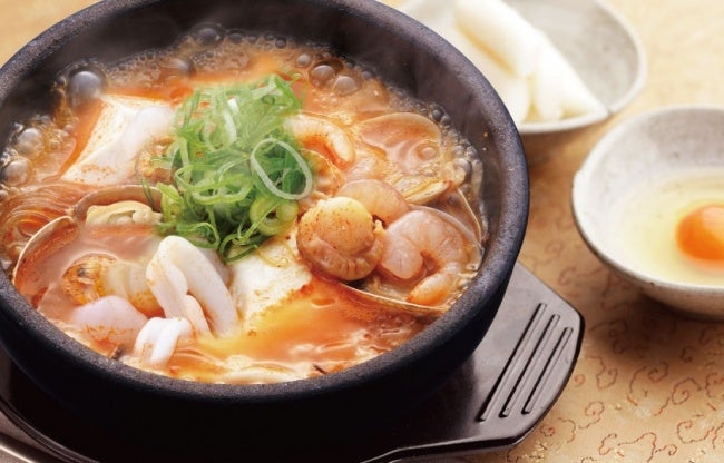 韓丼の名物であるスン豆腐は、お豆腐とアサリや牛スジ、ホルモン、豚肉などさまざまな具材をトウガラシベースの調味料で煮込んでいます。