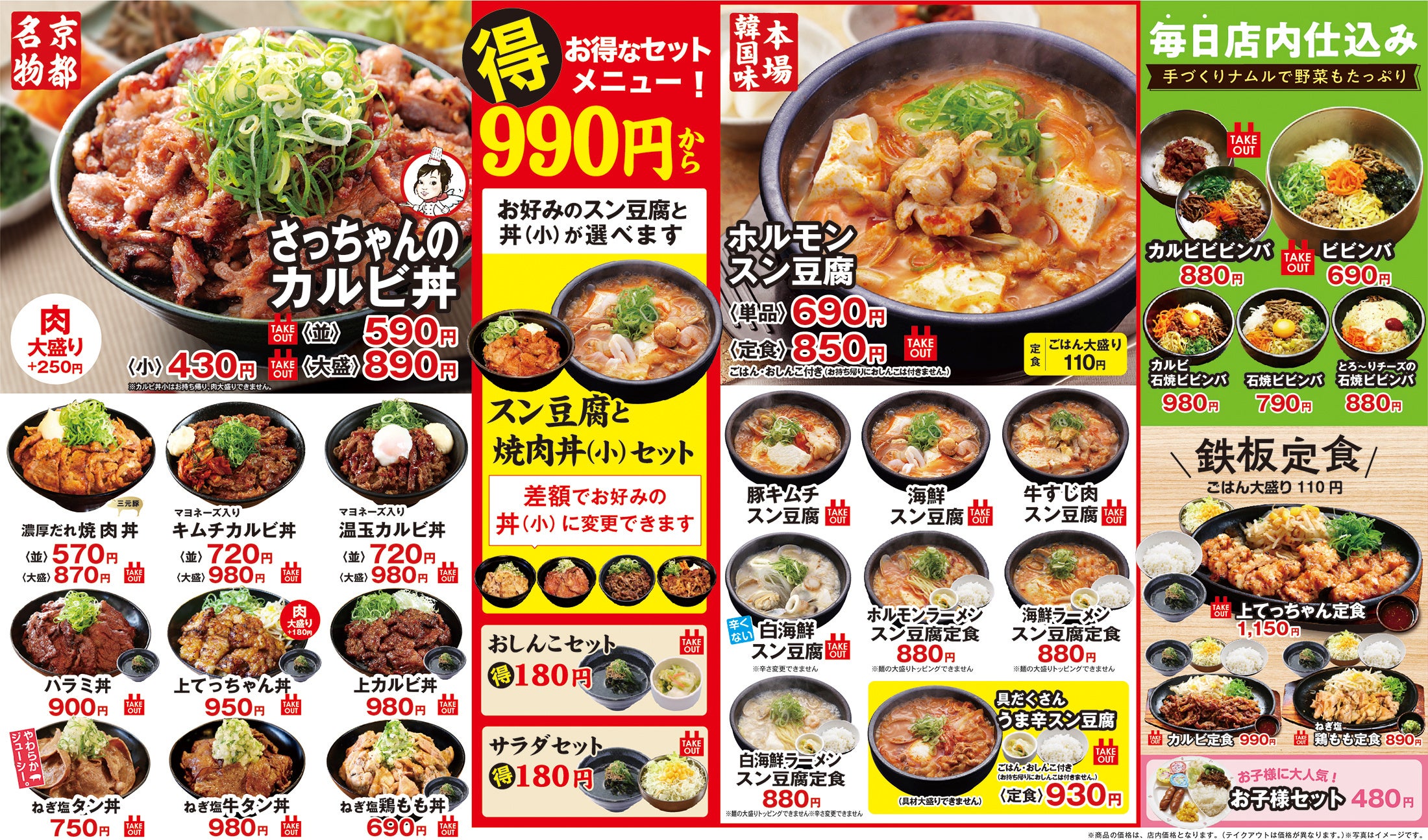 丼とスン豆腐がセットで食べられるお得なセットメニュー(990 円税込)も大人気です。他にも石焼きビビンバ、焼肉鉄板定食、期間限定メニューなどバラエティ豊かなメニューをお手軽価格で取り揃えており、ほとんどのメニューがテイクアウトでご利用いただけます。