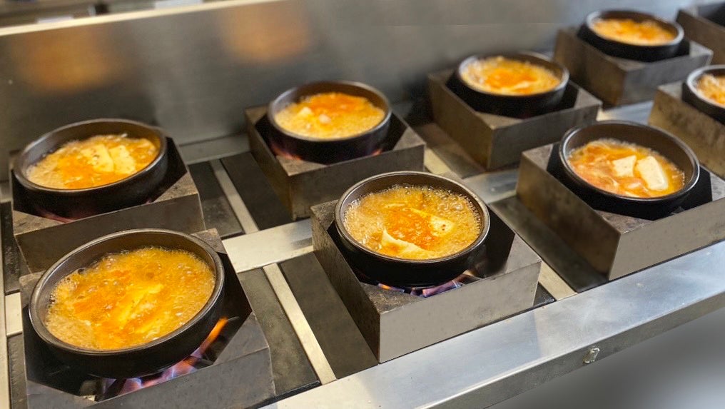 また土鍋で豆腐やアサリ、牛すじをぐつぐつ煮込む名物「スン豆腐」は本場韓国の材料を使用し調味料にもこだわりを持ち韓国の味をしっかり表現しています。秘伝のタレやスン豆腐のベースであるオリジナルの調味料は毎日自社工場での手づくりにこだわっています。母体である焼肉店の頃から手づくり主義を掲げ、自社工場でフレッシュな野菜や果物を独自の配合でたっぷり使用し、日によって季節によって調理法•配合を変えています。