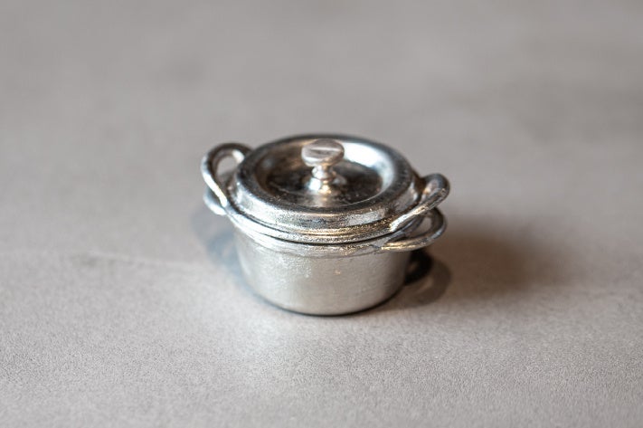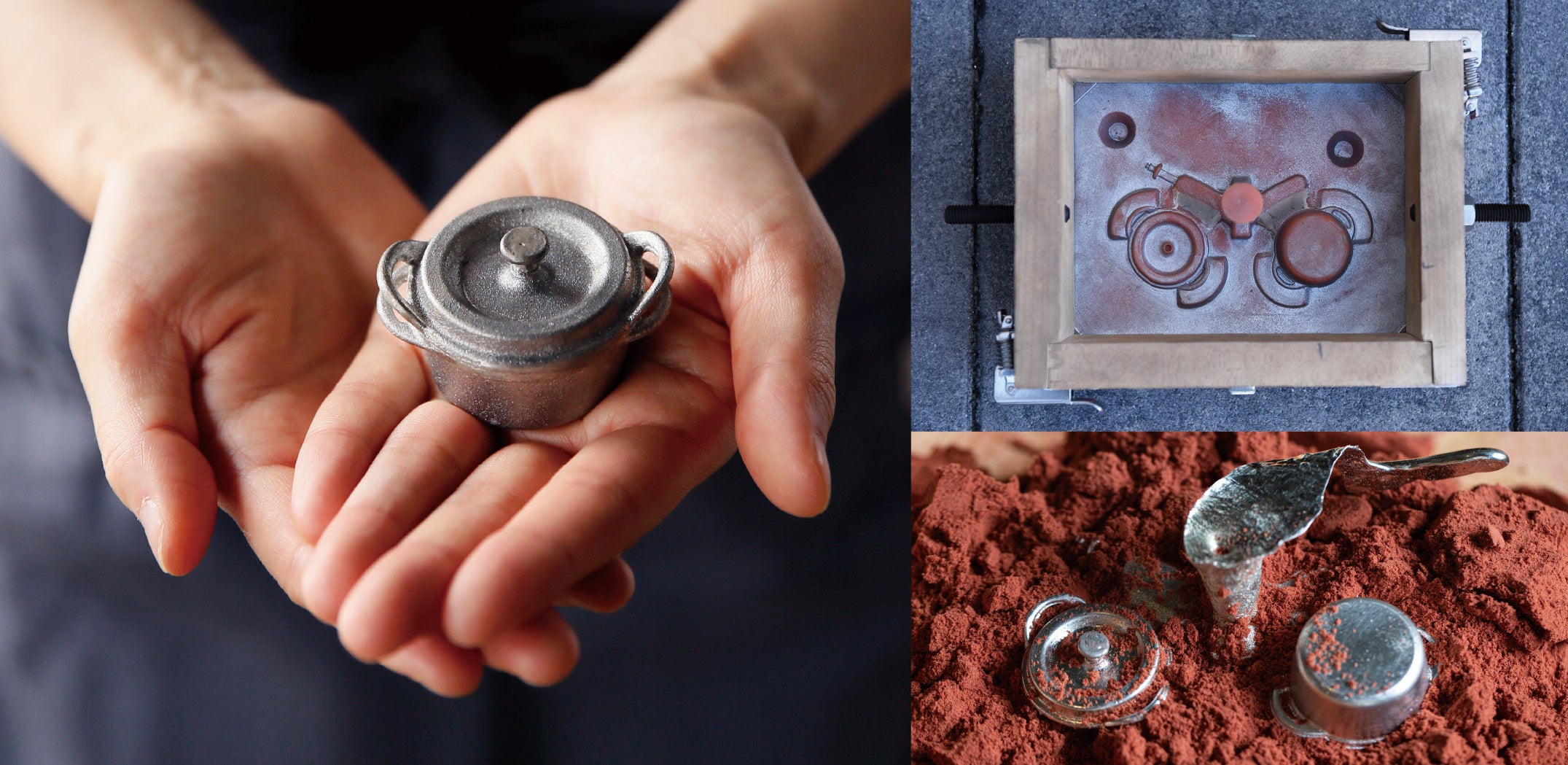このワークショップでは、手のひらサイズのミニチュアバーミキュラを、錫を使ってご自身でおつくりいただけます。バーミキュラの鍋を製造する工程は大きく分けて、鋳造工程、精密加工工程、ホーロー加工工程の3つ。その中でも鍋の形をつくる最初の工程「鋳造」を、錫を使って体験いただけます。まず、樹脂でできた原型(げんがた)に砂を詰めて砂の型を作り、そこに250℃以上に熱した錫を流し込みます。錫が冷えて固まったら砂から取り出し、不要な部分を切り離し、表面をヤスリなどできれいに仕上げたら、ミニチュアのバーミキュラの完成です。完成した直径約3.5cmのかわいらしいミニチュアバーミキュラはワークショップ参加者だけのお土産としてお持ち帰りいただけます。