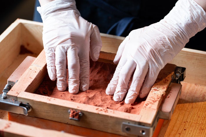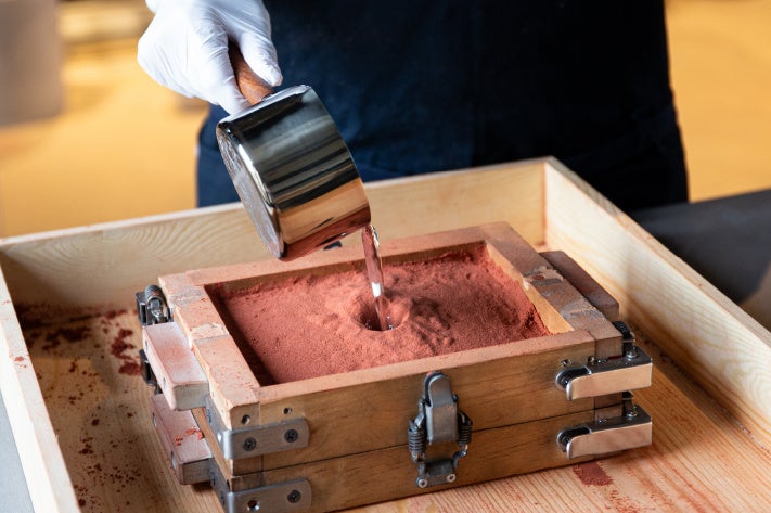 1で出来た砂型が崩れないように樹脂型から丁寧に取り外し、上型と下型を組み合わせて、錫を流しいれる湯口をつくります。湯口は錫を流し込みやすいように大きく広げ、まわりの砂はしっかり固めていきます。錫を流し込む準備が完了です!