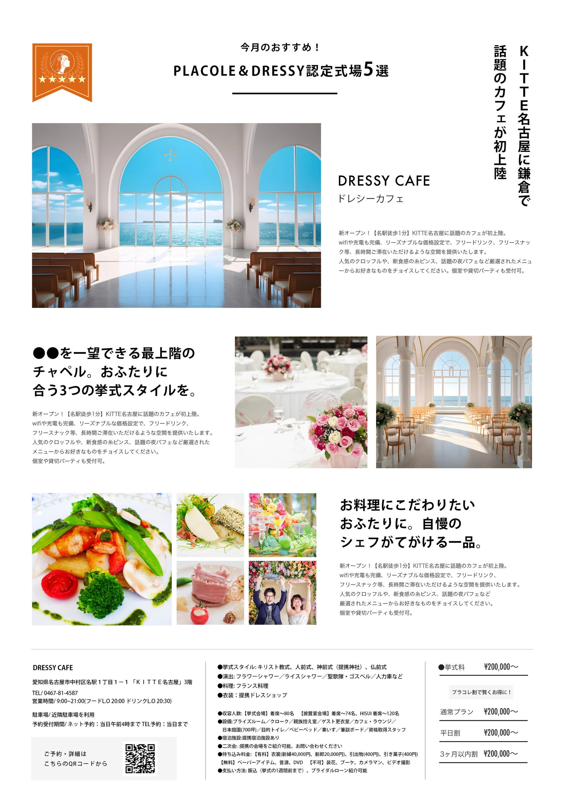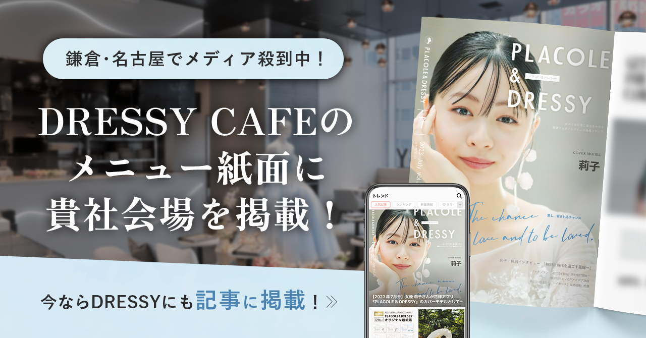 『個性が煌めく魔法の言葉』 “100人の人生に100通りに煌めく魔法をかける”をテーマに創設された古都鎌倉発のラグジュアリーブランド、PLACOLE&DRESSY(プラコレ&ドレシー)がプロデュースする名古屋駅直結KITTE名古屋3Fウェディングのテーマパークカフェ『DRESSY CAFE -きらめく魔法にかかる空間-』にて、カフェメニュー内に”結婚式場PR”掲載ができる新プランを開始することが決定。カフェにご来店していただいている1万人/月のお客様にそれぞれの結婚式場の魅力を発信ができ、さらに初回特典として、40万円相当のDRESSY取材掲載・ショート動画3本分がつく特別プランとなっております。