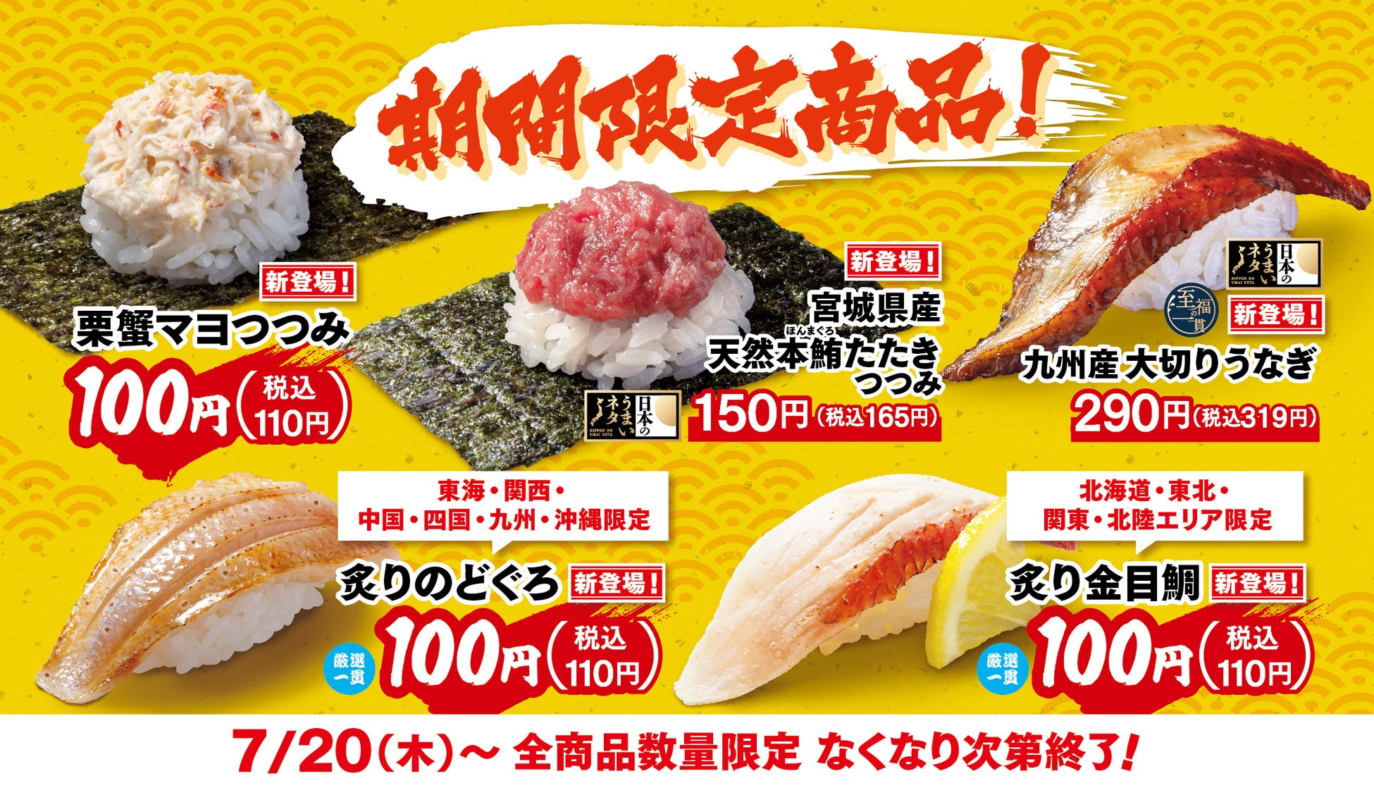 また、地域限定で、口いっぱいに広がる上品な甘みが絶品の「炙り金目鯛100円(税込110円)」と炙ることで脂の旨みを閉じ込めた「炙りのどぐろ100円(税込110円)」を販売します。数量限定のため、どうぞこの機会をお見逃しなく!