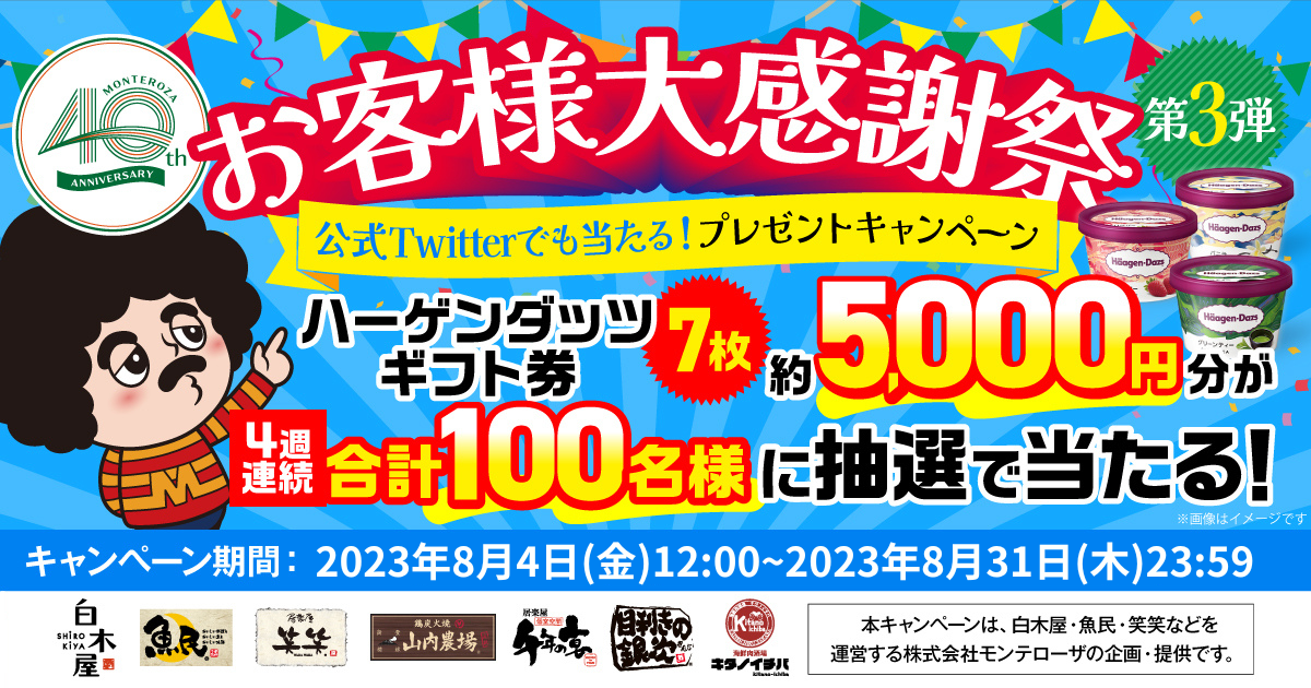 ㈱モンテローザグループの公式Twitterアカウント(白木屋おじさん@株式会社モンテローザ)をフォロー&対象ツイートのリツイートを条件に4週連続、毎週1回の抽選(計4回)。合計100名様にハーゲンダッツ ギフト券7枚(約5000円分)(※3)をプレゼントします。