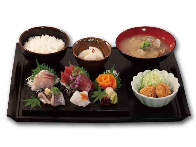 旨みが凝縮された熟成チルドポーク、サクッと香ばしい特製パン粉を使用した松のや自慢の看板メニュー「上ロースかつ」をメインに、すし松自慢の「刺身3点盛」と「あさりの味噌汁」が付いたこちらもボリューム満点の御膳。ライス大盛無料。