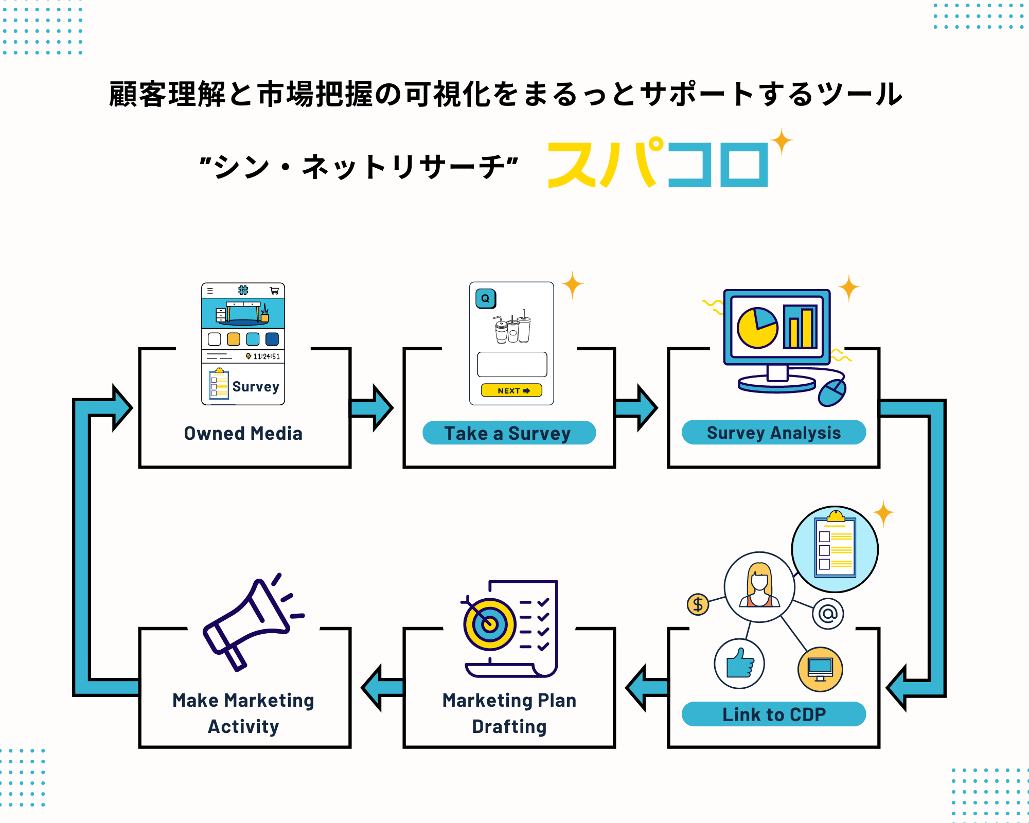 モニタスが提供するサービス『スパコロ』は、市場状況と顧客理解を可視化し、ワンストップでサポートするツールです。自社会員IDと紐付けたアンケート調査、さらにアンケートモニターと組み合わせたリサーチが可能になるため、企業側はより深い顧客理解や市場把握を自社完結で行うことができるようになります。さらにユーザーは企業のアンケートに参加することでポイント還元やプレゼントなどのメリットを受けられるので、サービス活性化にも繋がります。