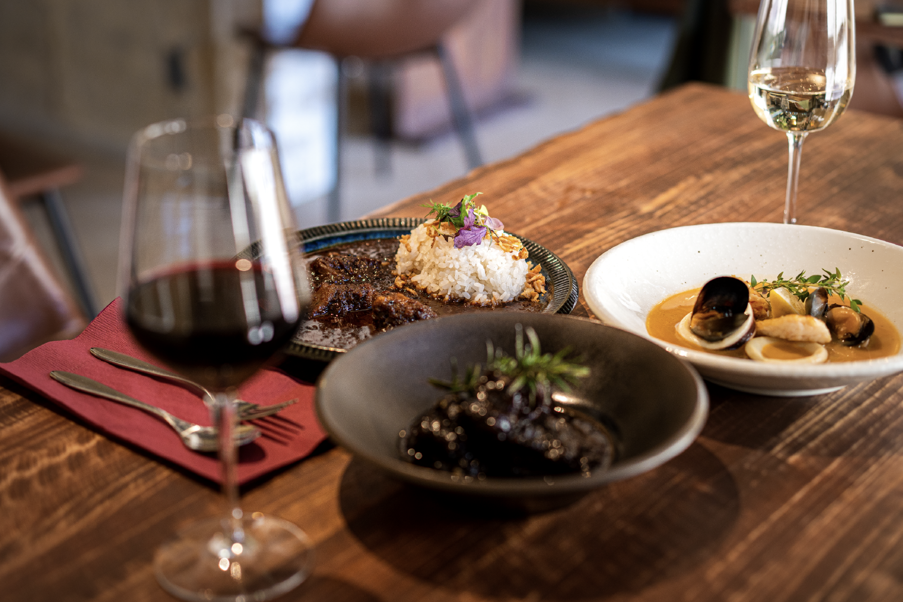 左から、地魚のブイヤベース、淡路牛カレー、えびすもち豚のプルーン煮(盛り付けイメージ)