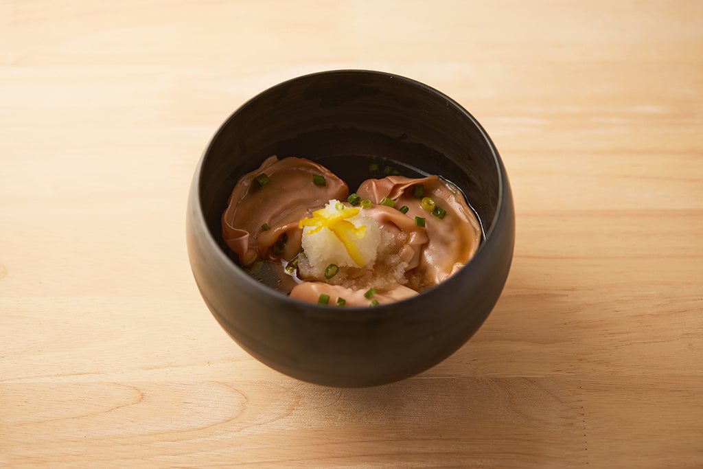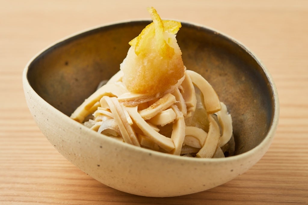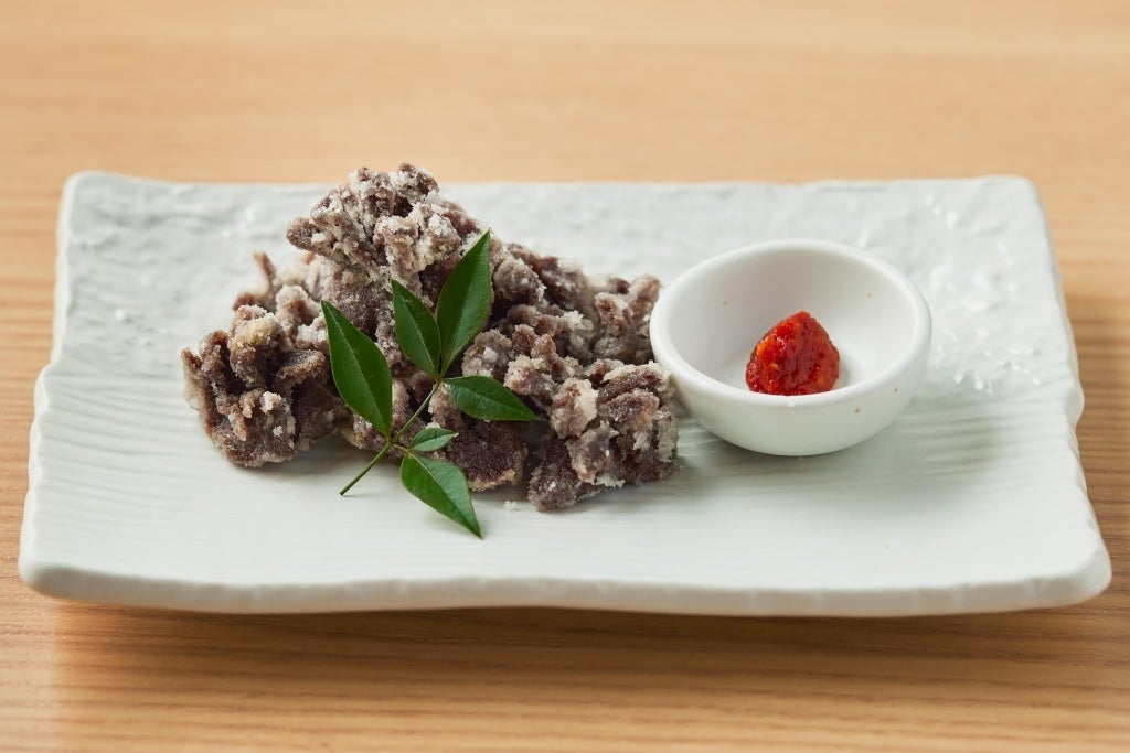 淡白だからこそ油との相性が良く、肉の旨み をストレートに表す「ささみ」を、❝天使の髪❞と呼ばれるほど細い麺・カダイフで包んで揚げました。外はサクサク、中はジューシーなフライは、長崎県・五島灘産の塩で作った柚子塩で、さらに味が際立ちます。