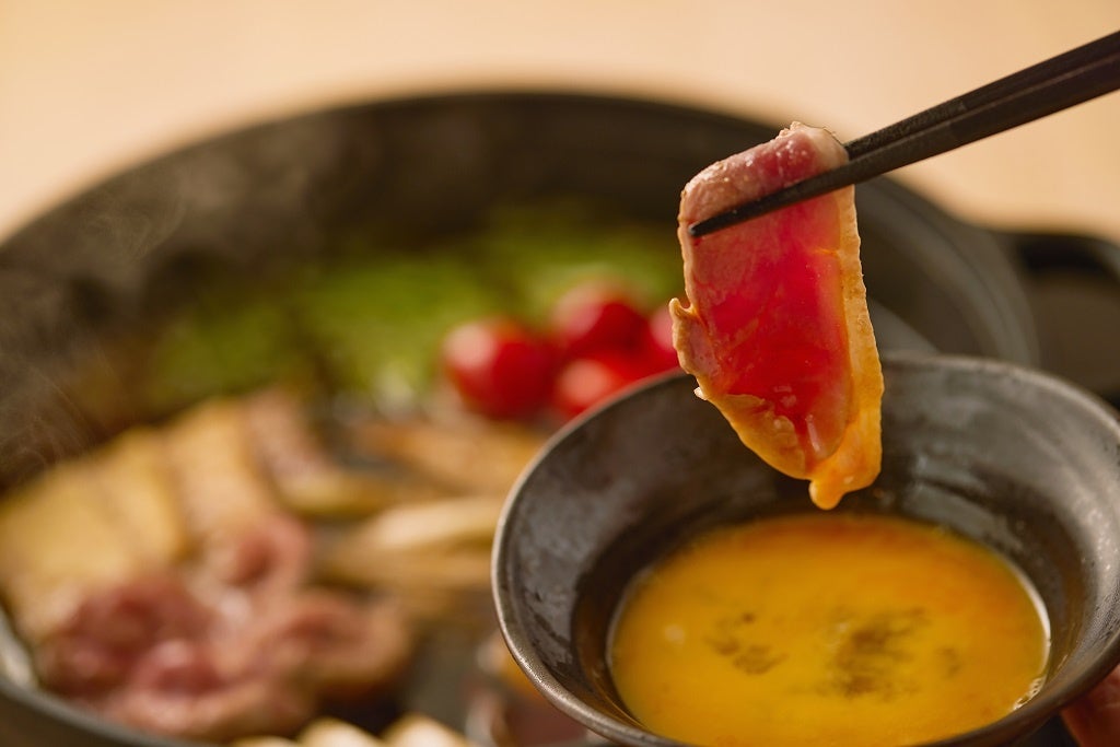 「しゃぶしゃぶ」と並び立つ日本人のご馳走の代表格と言えば「すき焼き」。昨年秋より一号店でご提供を開始したところ、「鴨しゃぶ」に比肩するほどご好評いただき、二号店では、グランドメニューとして堂々ラインナップすることができました。