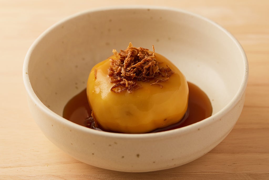 登場した瞬間「丸ごとのじゃがいもを使った肉じゃが⁉」と驚いてしまうルックス。箸を入れるとその正体に次なる驚きが…!鴨肉、玉ねぎ、糸こんにゃく、そしてじゃがいもを甘辛く味付けた、見た目は奇抜ながら、❝ザ・王道❞の美味しい肉じゃがです。
