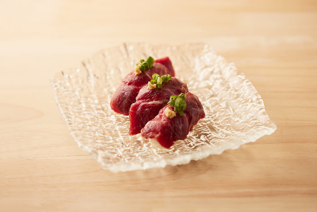 宴を粋に締めたい時、寿司は特に場によく合 います。しっとりと張りのある肉質で柔らかく、馬肉特有の旨みが凝縮した赤身の寿司は、高級魚の握りにひけを取らない美味さで華やかな締めのひと時を演出します。
