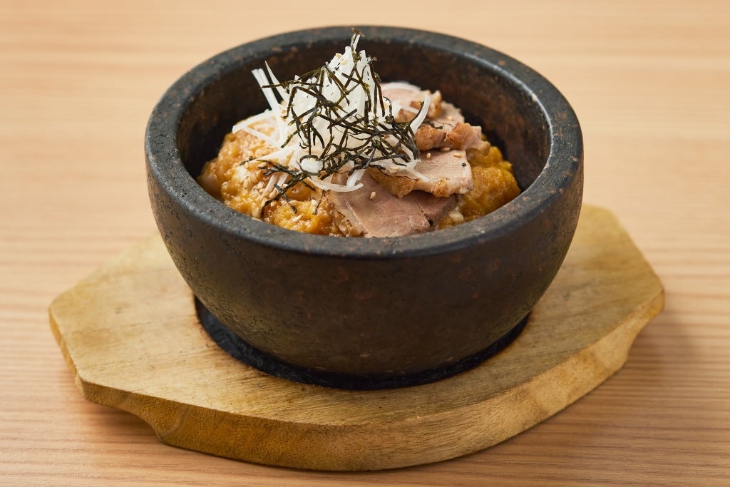 玉子でとじた鴨肉のそぼろ餡と、丁寧にローストした厚切りの鴨肉を乗せた、鴨肉の旨みを存分に味わえる食べ応えのある〆ご飯。 アツアツの石椀でできるお米のおこげも、旨みの一つです。