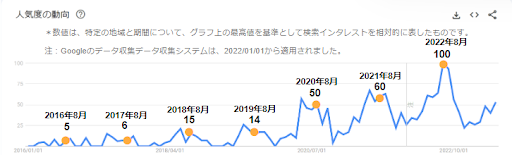 データから夏に近づくと検索数が増え、年々数値も大きくなっていることが分かります。