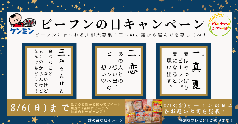 弊社では、毎年「ビーフンの日」にちなんだイベントやキャンペーンを企画しており、ビーフンやライスヌードルなど、お米のめんに興味・関心を持ってもらいたいと考え、今年はビーフンにまつわるエピソードを川柳で募集します。