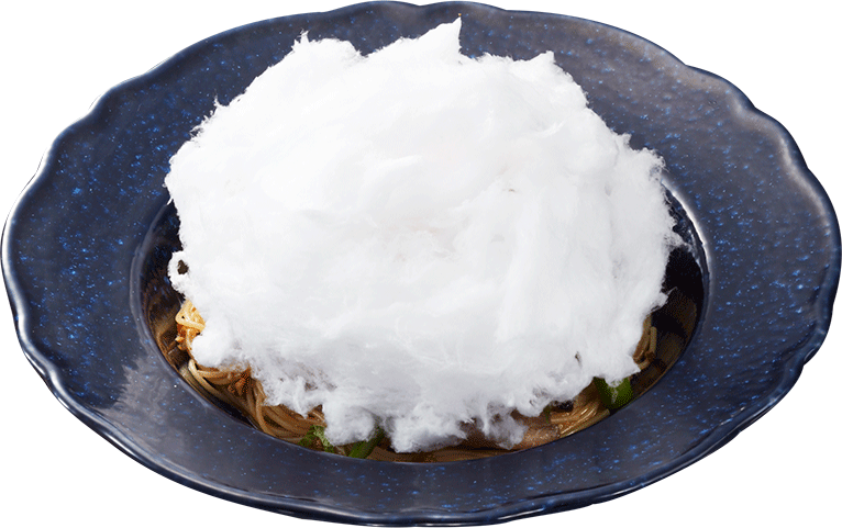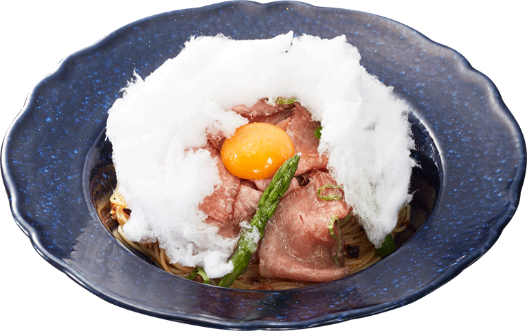 お皿いっぱいにのった、ふわふわのコットンキャンディに野菜だしを注ぐと、卵黄やアスパラなどの色鮮やかな具材が現れる新感覚の冷製パスタです。醤油ベースのパスタに、たっぷりのローストビーフや卵黄、コットンキャンディを組み合わせ、すき焼き風の甘辛いパスタに仕上げました。お好みで別添えの西洋わさびやブラックペッパーを加え、キレのある味わいへの変化をお楽しみください。