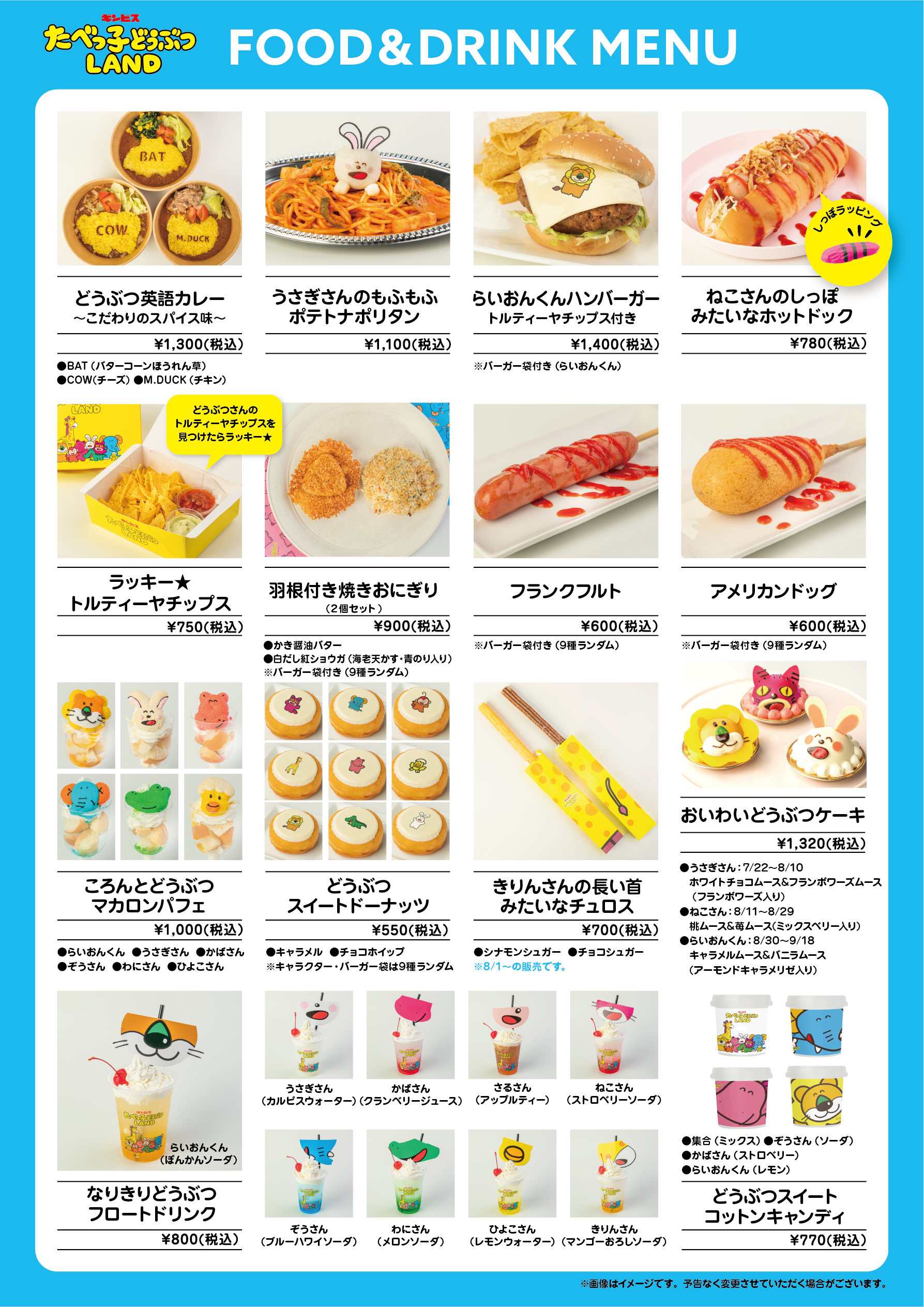 『たべっ子どうぶつLAND』でしか味わえないフード&ドリンクメニューをお楽しみください。
