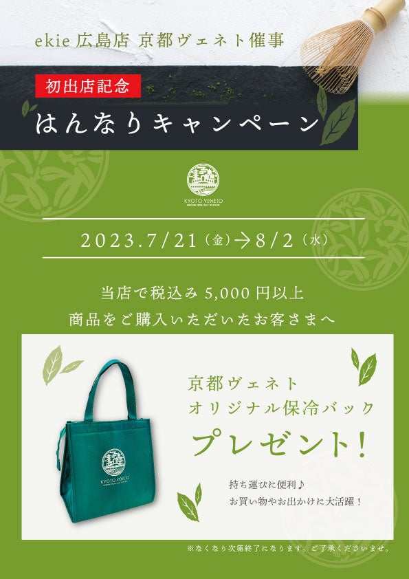 「洋菓子の温故知新」をコンセプトに斬新な抹茶スイーツを展開する「京都ヴェネト(株式会社寿庵)」は2023年7月21日(金)~8月2日(水)の期間、ekie広島に期間限定出店いたします。