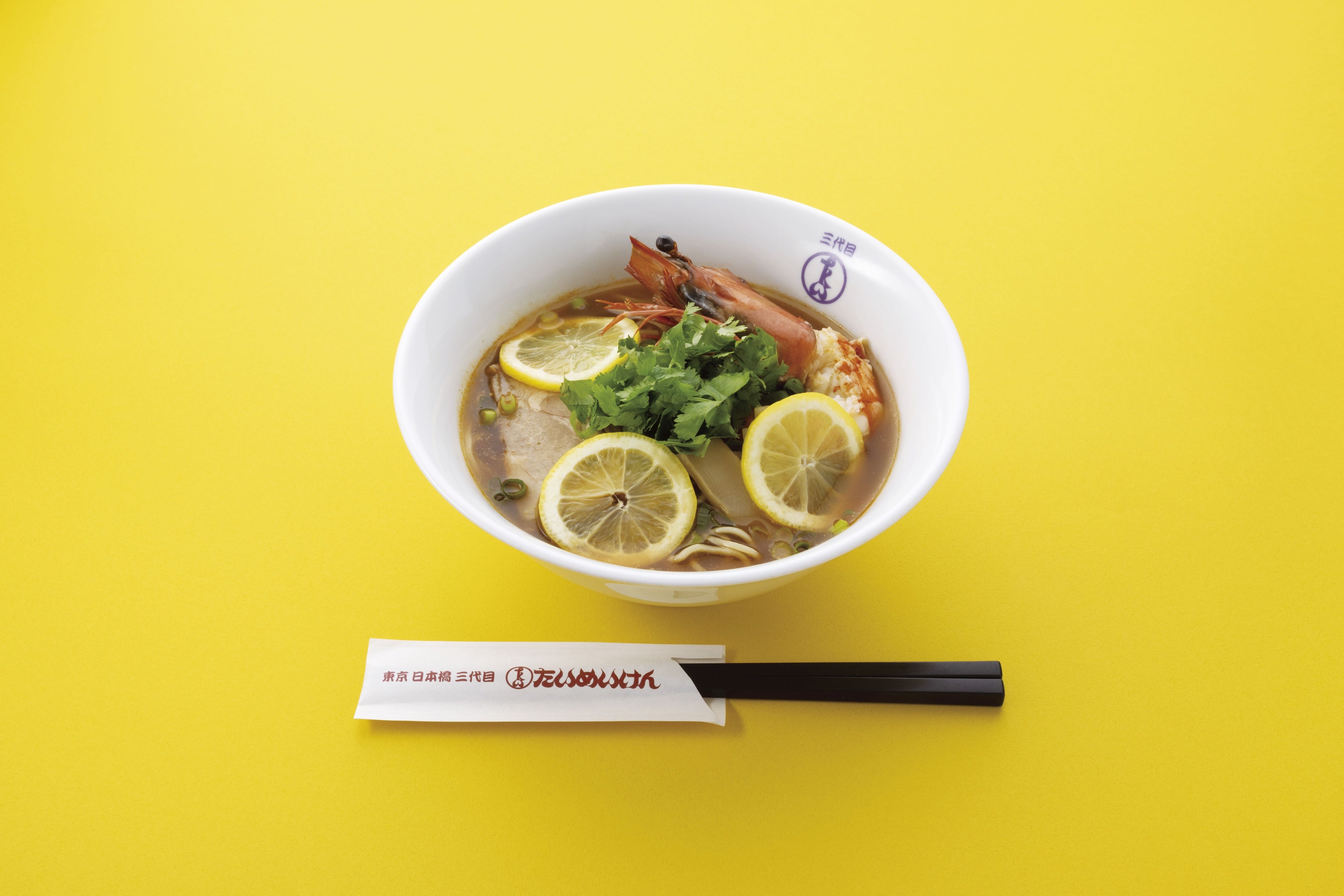 エキュート上野店限定、夏季の新メニュー!大きなエビが目を引き、パクチーとトムヤムクンの香りが食欲をそそるラーメン。こってりかと思いきや、レモンで後味は爽やかです。