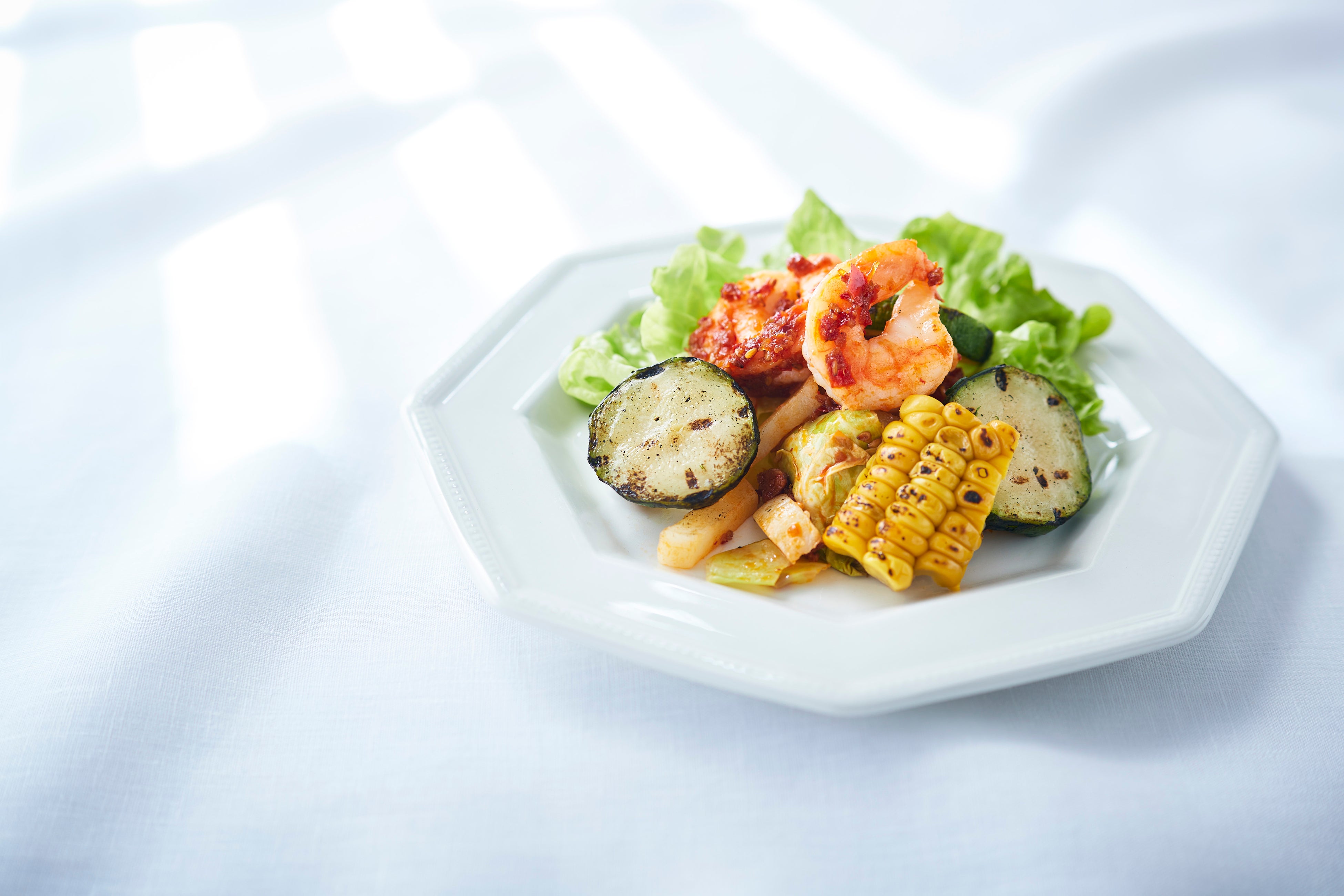 ねぎ、にんにく、生姜、干し海老などを揚げた旨味と香りに、唐辛子の辛味を加えてやみつきに仕立てた「食べるハリッサ」でズッキーニと海老を一緒に味わうサラダ。「食べるハリッサ」がズッキーニと海老と絡んで食欲そ