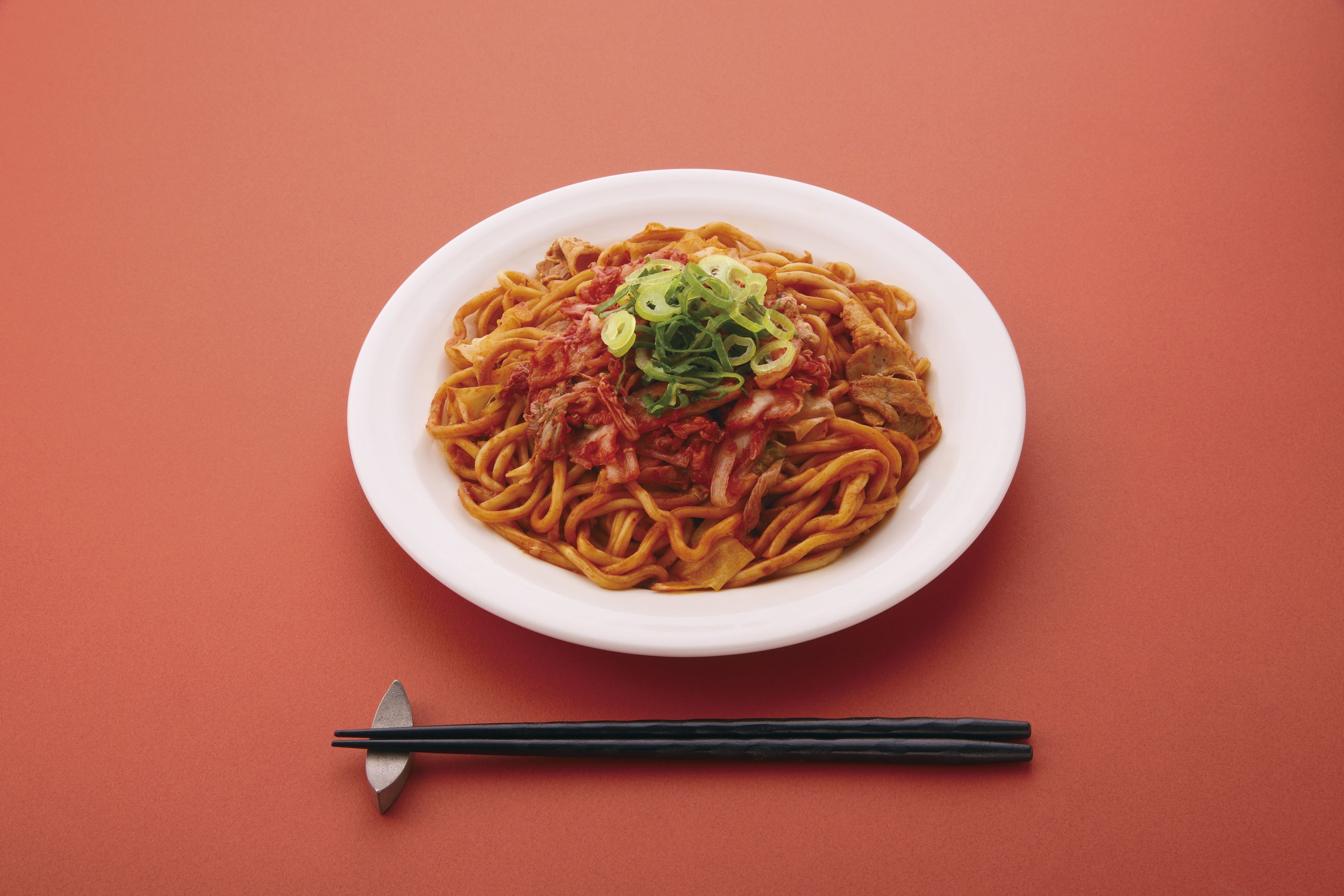 夏にピッタリ!ピリ辛焼きそばに仕上げました。ピリ辛のチゲソースと辛さ十分のキムチが食欲をそそります。