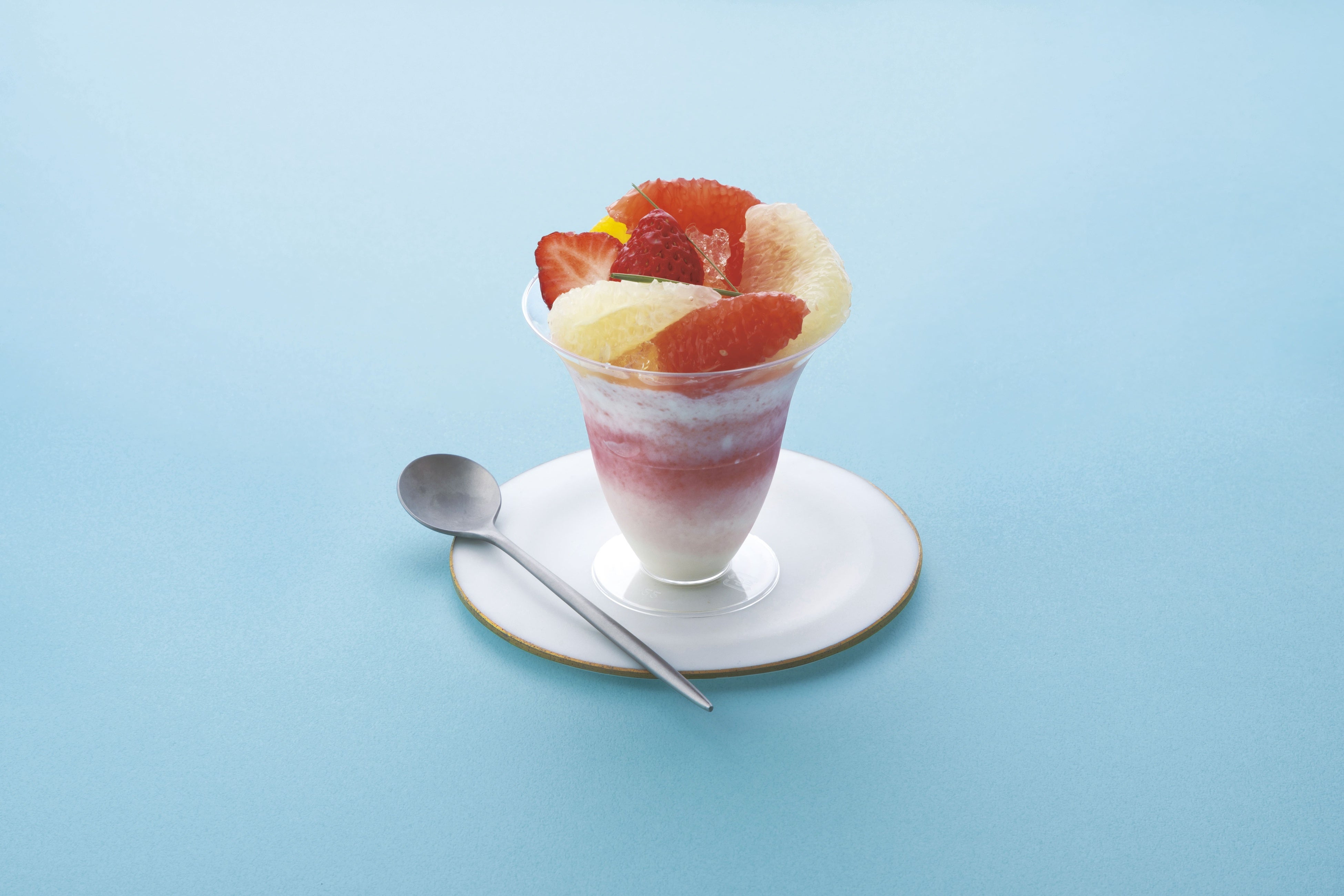 夏季限定、甘すぎないヨーグルトのムースに甘酸っぱいフランボワーズソースを合わせました。グレープフルーツなどフルーツたっぷりで爽やかにお召し上がりいただけるスイーツです。