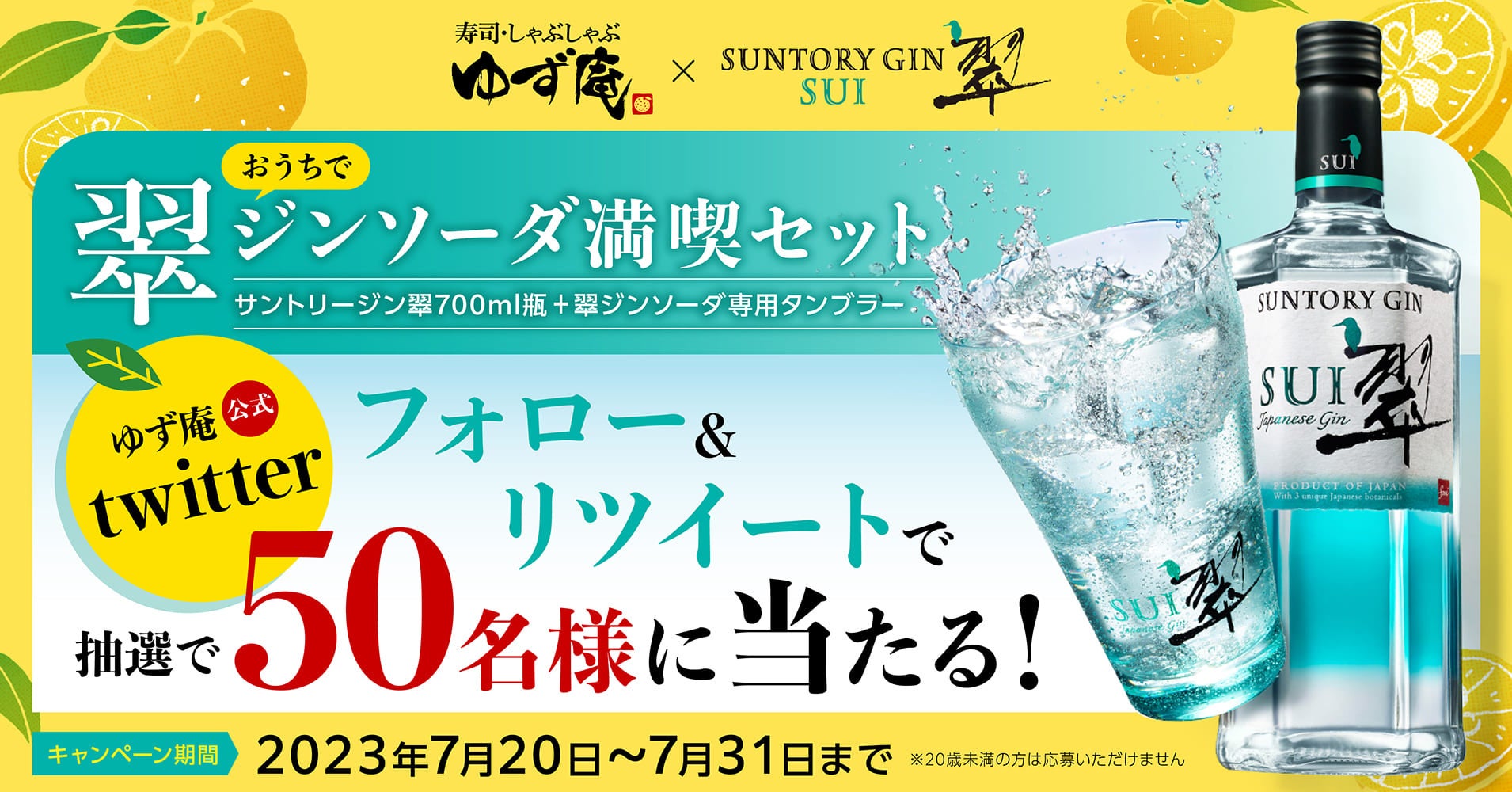 株式会社物語コーポレーション(本社:愛知県豊橋市/代表取締役社長:加藤 央之)が全国94店舗展開する『寿司・しゃぶしゃぶ ゆず庵』(以下、ゆず庵)は、お客様の日頃のご愛顧に感謝を込めて、本日より公式Twitterにて「おうちで翠ジンソーダ満喫セット」が当たるプレゼントキャンペーンを開催いたします。