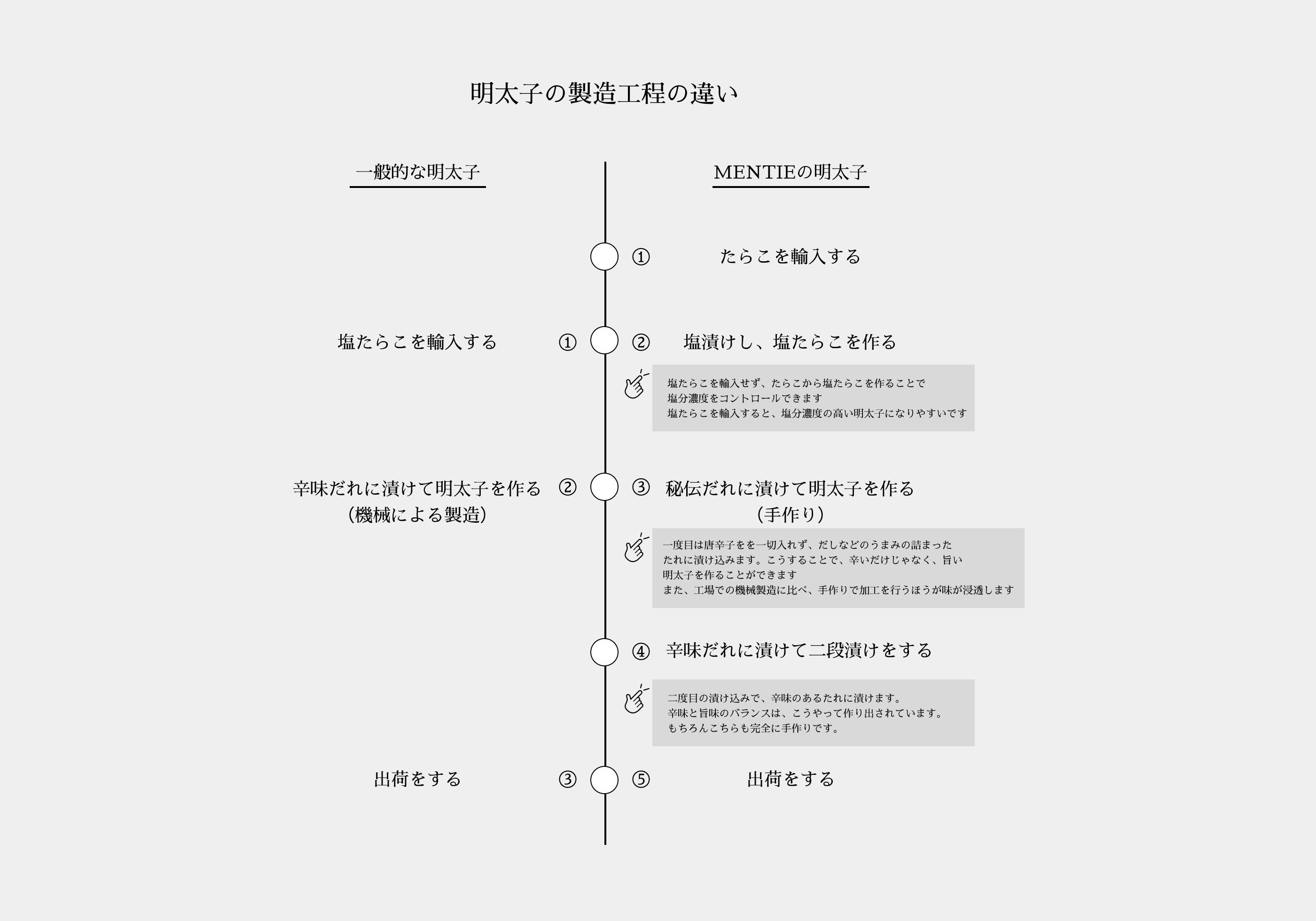 「MENTIE」は、一般的な明太子ブランドと比較して、製造の工程が多く、そのすべてを手作りで行っています。控えめな塩分、辛すぎない、甘味すら感じる味、しっかりとした粒感は、この工程だからこそ生み出されます。