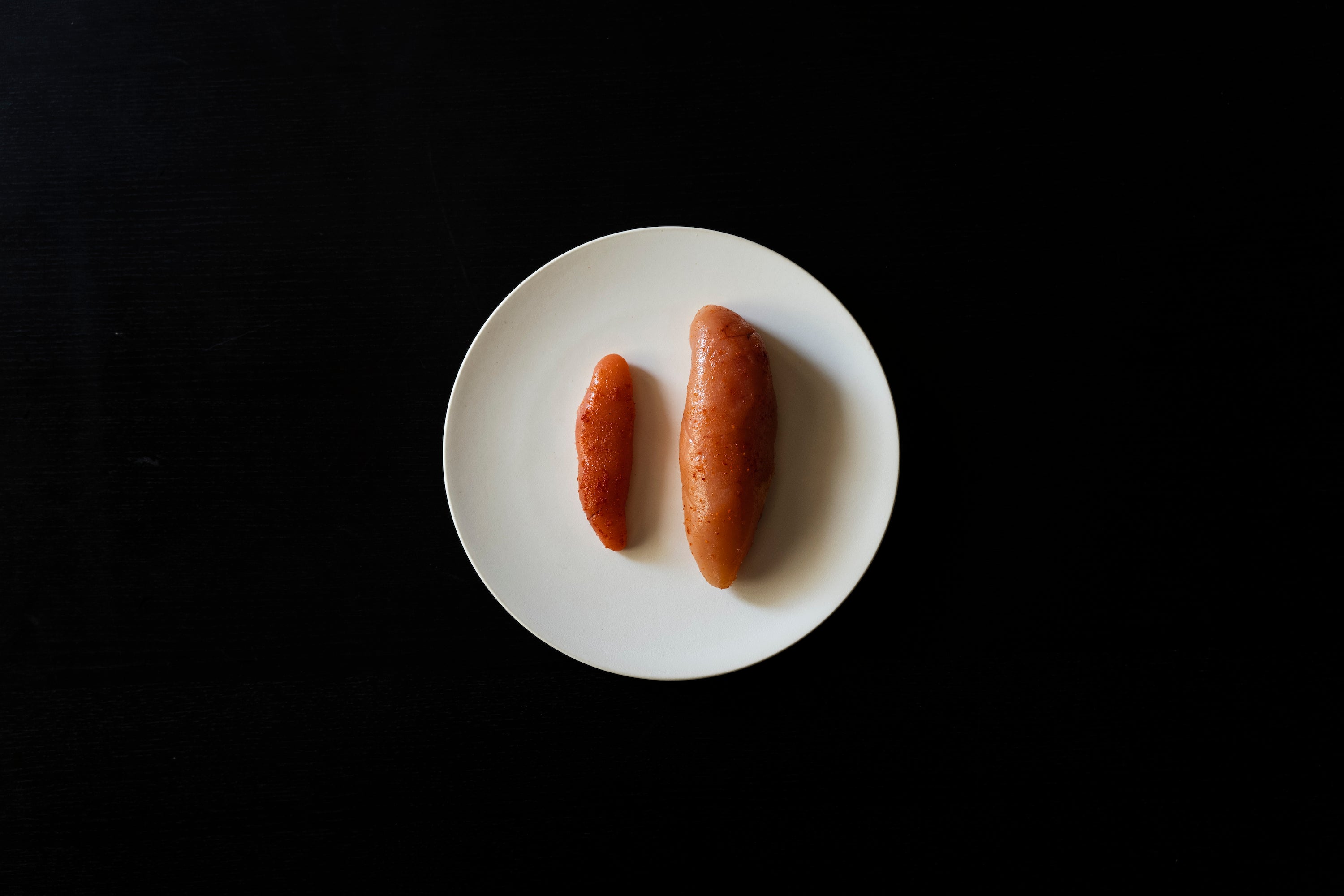 左側の一般的な明太子のサイズに対して、右側の「MENTIE」はサイズが2倍ほどです。明太子の原材料であるたらこのサイズは個体差はありますが、「MENTIE」は大きいサイズのたらこだけを使用しております。