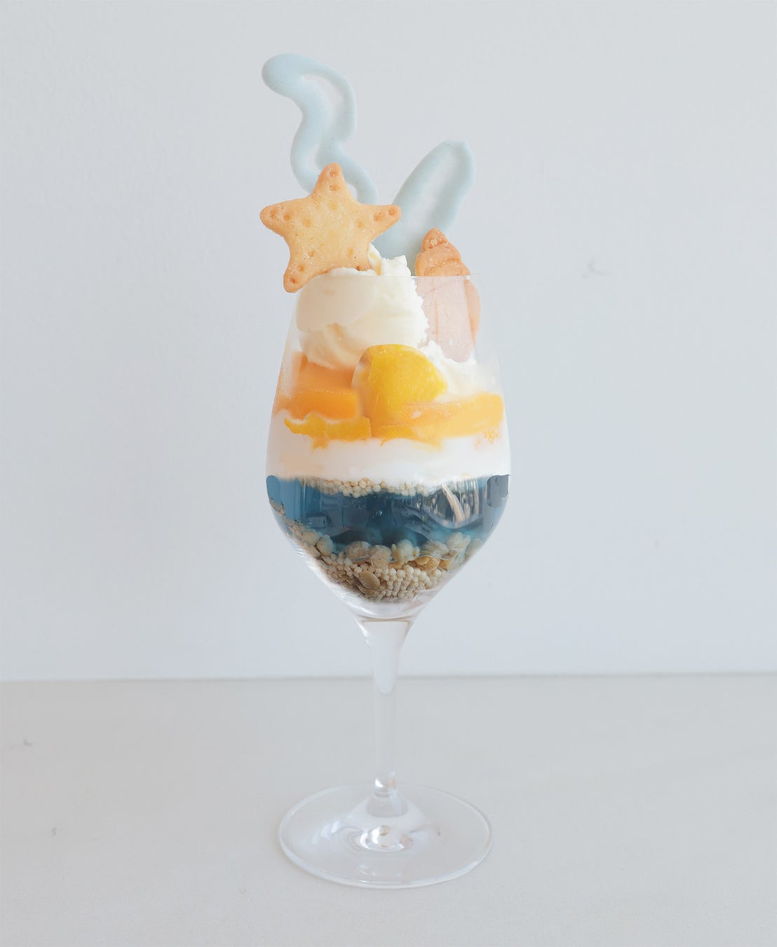 海の底を表現したフォトジェニックなパフェ。トロピカルフルーツやココナッツアイスなど夏にぴったりのフレーバーのハーモニーをお楽しみください。