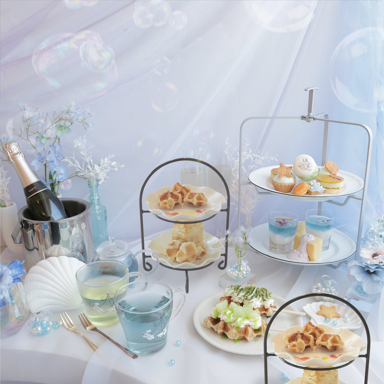 看板メニューのアフタヌーンティーにはマーメイドをテーマに海をイメージしたモチーフのスイーツが新たに登場。貝殻やヒトデといった、海をイメージしたモチーフのスイーツが並びます。ムース、タルト、シフォンケーキ、ゼリー、マカロンなど、様々な食感・風味をお楽しみいただけます。※ご予約は2名様より承っております。