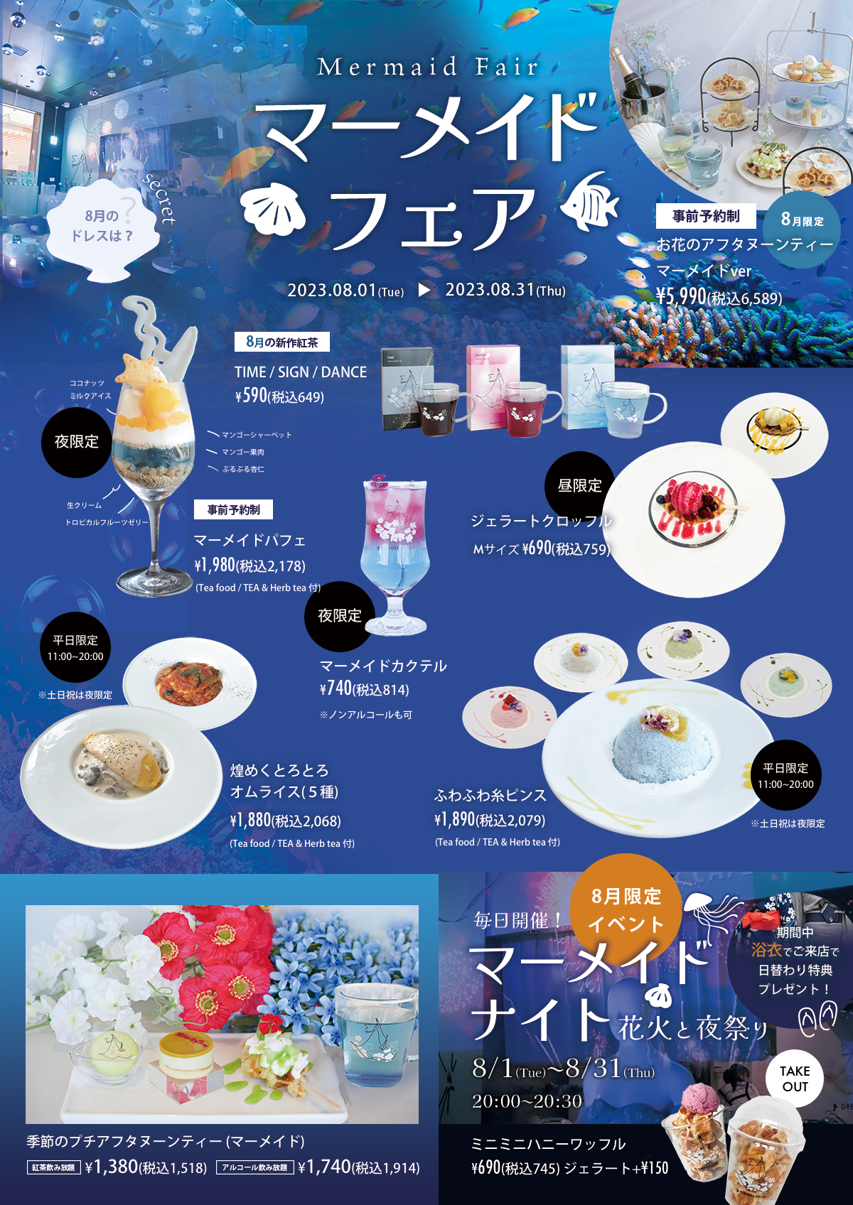 看板メニューのアフタヌーンティーにはマーメイドをテーマに海をイメージしたモチーフのスイーツが新たに登場。それ以外にもオリジナルブレンドの紅茶を使用し、マーメイドカラーを表現したスペシャルカクテルや、夜限定メニューに海の底を表現したフォトジェニックなパフェも新登場。 他にも推し活に大人気のプチアフタヌーンティーがマーメイドのアフタヌーンティーとしてフェアを彩ります。名古屋店では毎日夜限定イベントとして、マーメイドナイトを開催。 花火の映像を眺めながらお祭り気分をご堪能いただけます。 夏夜に大切な人と忘れられない思い出づくりのきっかけや非日常体験を提供します。