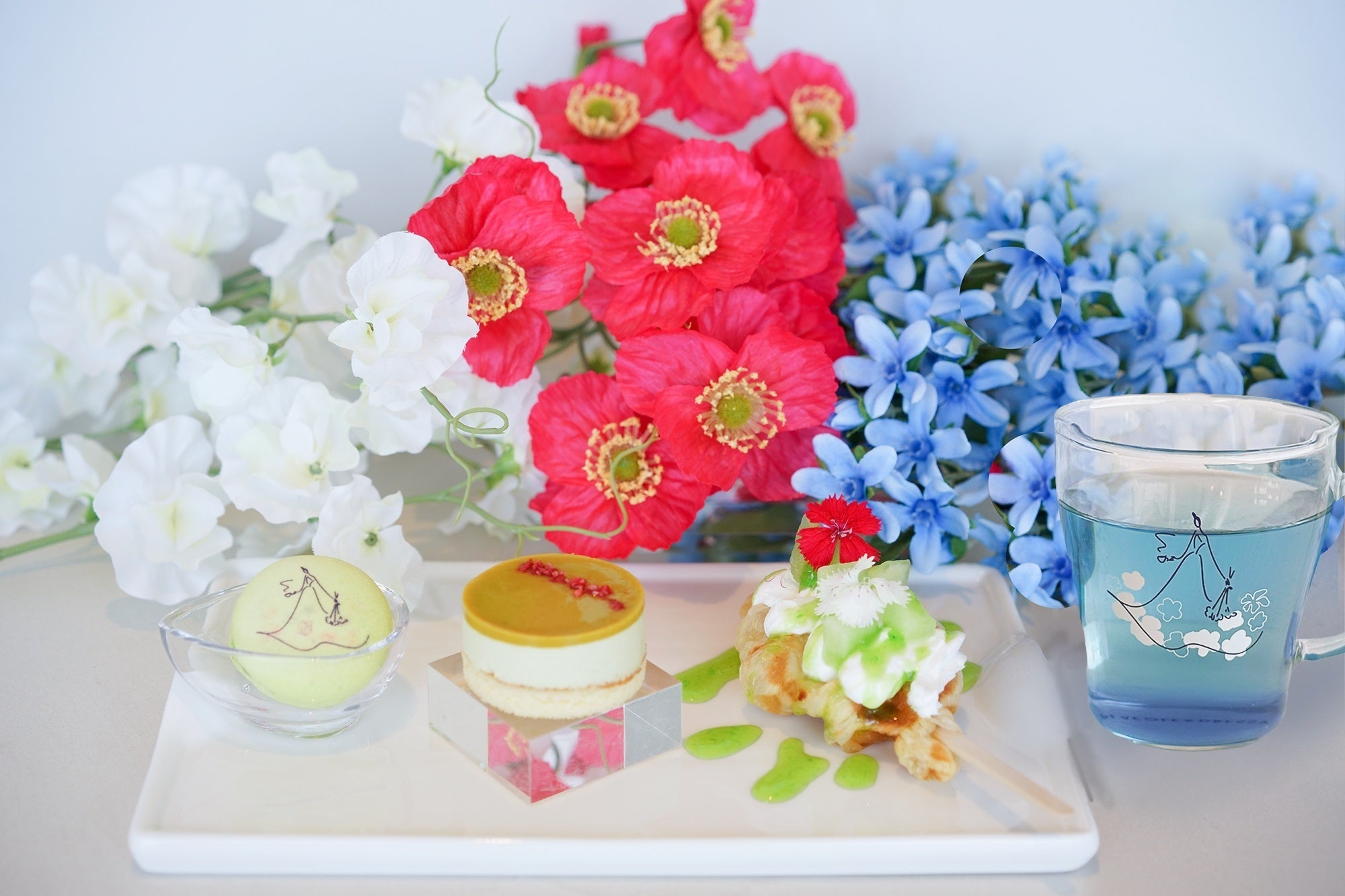 8月限定のプチアフタヌーンティーは、マーメイドの髪をイメージしたレッドのお花をトッピングした限定クロッフルをメインに、芳醇な味わいが溶け込んだピスタチオのマカロン、濃厚な香りが特徴のピスタチオを使用したムースケーキの3種のスイーツ。マーメイドカラーのお花で彩られた見た目で推し活にもおすすめです。