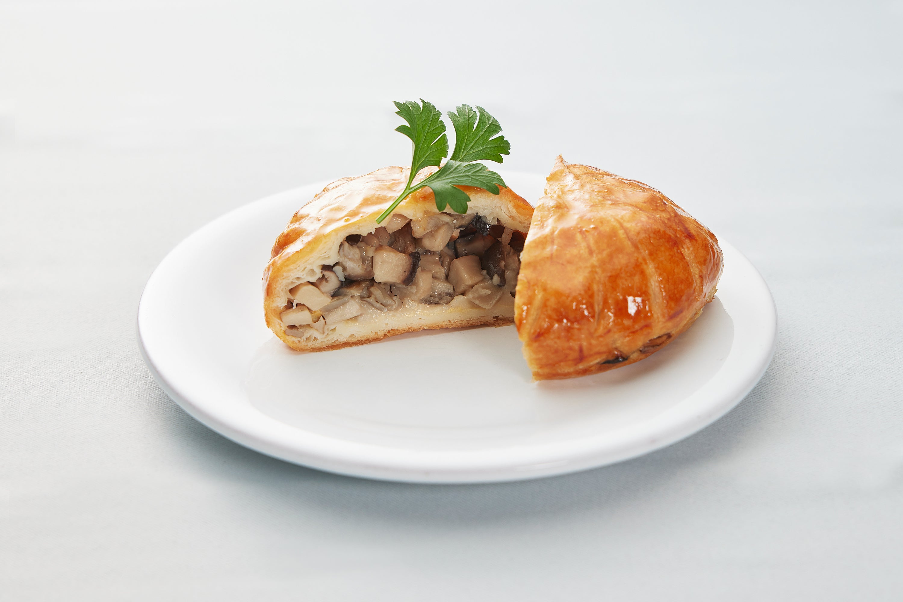 芳醇な香りのきのこに自家製ベシャメルソースを加え、パイで包み焼きにしました。きのこを存分に味わえる一品です。そのままでも美味しくいただけますが、オーブンで30 秒あたためるとパリッとした食感が味わえます。