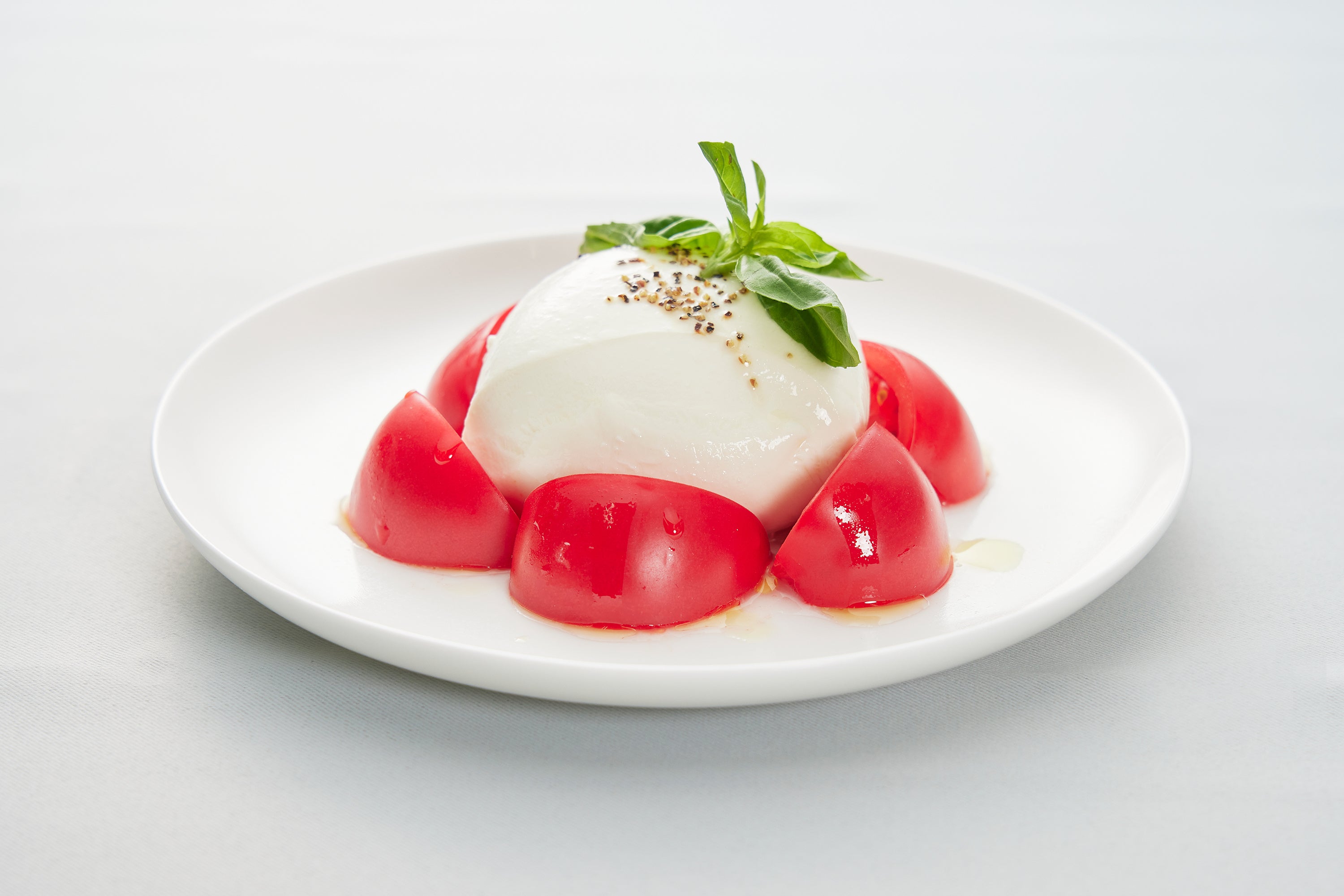 希少価値の高い水牛の乳から取れるモッツァレラチーズとみずみずしいフルーツトマトをふんだんに使用したカプレーゼ。使用しているチーズは南イタリアのナポリを中心とするカンパーニア州原産の、大変希少価値の高いモッツアレッラチーズを使用しております。牛乳製のものよりもさらに真っ白で、さっぱりとした爽やかな酸味とジューシーなミルキーさが特長の高級食材と言われており、フルーツトマトとの相性は抜群です。