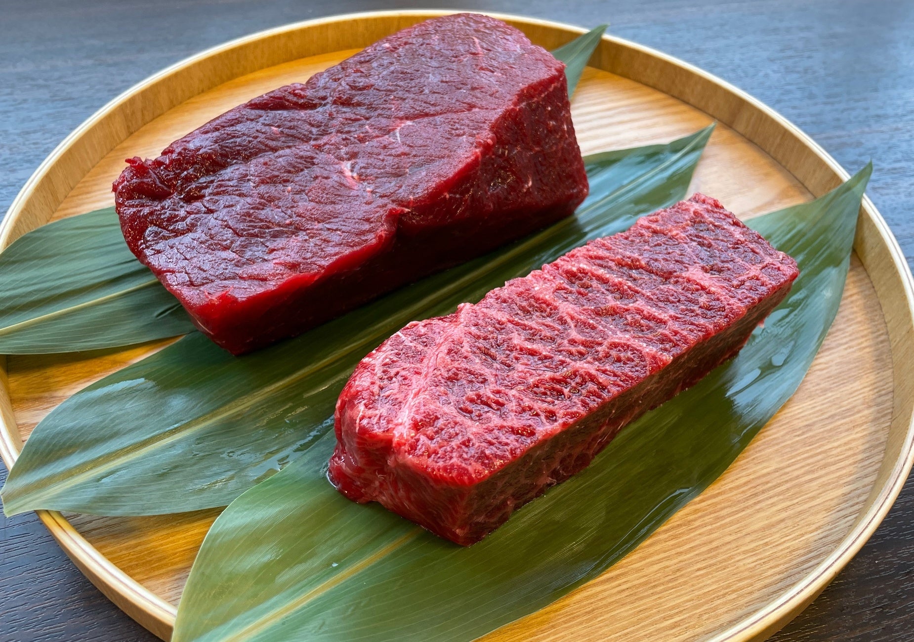 ※「鯨の生肉」は、冷凍肉と比べ、解凍による旨み成分の流出がなく、鯨肉本来の旨味が凝縮されており、