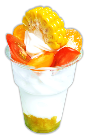 道の駅しなの本館食堂では毎月その月の旬の食材を使ったソフトクリームを販売しています。8月は『トウモロコシ・トマトフェア』。