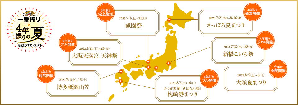 上記とは別に、「一番搾り」では「キリン一番搾り『4年振りの夏応援プロジェクト』」の一環として、4年ぶりに開催する「さっぽろ夏まつり」「新橋こいち祭」「大須夏まつり」「祇園祭」「大阪天満宮 天神祭」「博多祇園山笠」「さつま黒潮『きばらん海』枕崎港まつり」といった、「一番搾り」がサポートする全国のお祭りを特設サイト内にて紹介し、共に日本の夏を盛り上げていきます。