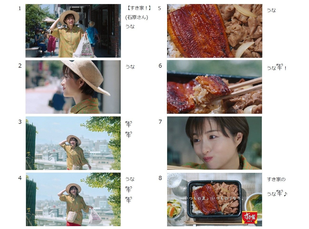 新TVCM「夏の散歩」篇は、街に出かけた石原さんが、今年も「うな牛」を楽しみに持ち帰る様子から始まります。朝顔が咲く街はすっかり夏模様。爽やかな日射しのもと、麦わら帽子をかぶった石原さんが「うな、うな、牛(ぎゅう)、牛!」と毎年恒例のリズムで歩いていきます。