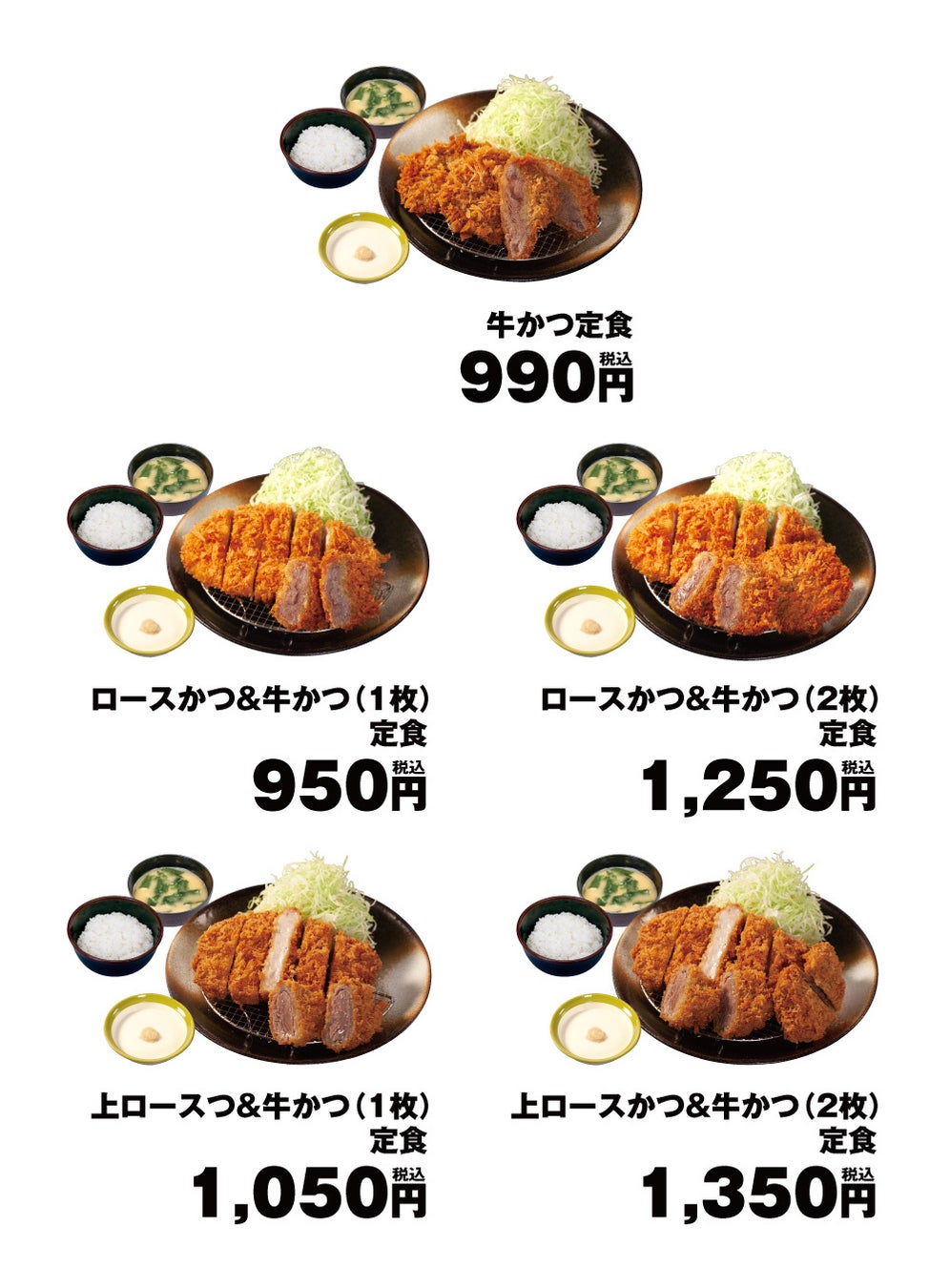 商品名 牛かつ定食 990円 ロースかつ&牛かつ1枚定食 950円 ロースかつ&牛かつ2枚定食 1,250円 ※全て税込価格です。また、店内・お持ち帰りの税込価格は同一です。 ※お持ち帰りいただけます。お持ち帰りのみそ汁は、別途60円でお買い求めいただけます。 ※株主優待券は上記全てのメニューにご使用いただけます。 発売日 2023年7月26日(水)午後3時~ 対象店舗 一部店舗を除く全国の松のや ※沖縄店舗、高速PA店舗では販売いたしません。 |