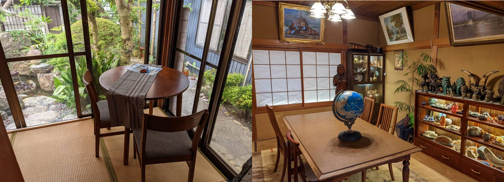 店内は畳敷きの和室や世界の民芸品、工芸品が飾られた部屋