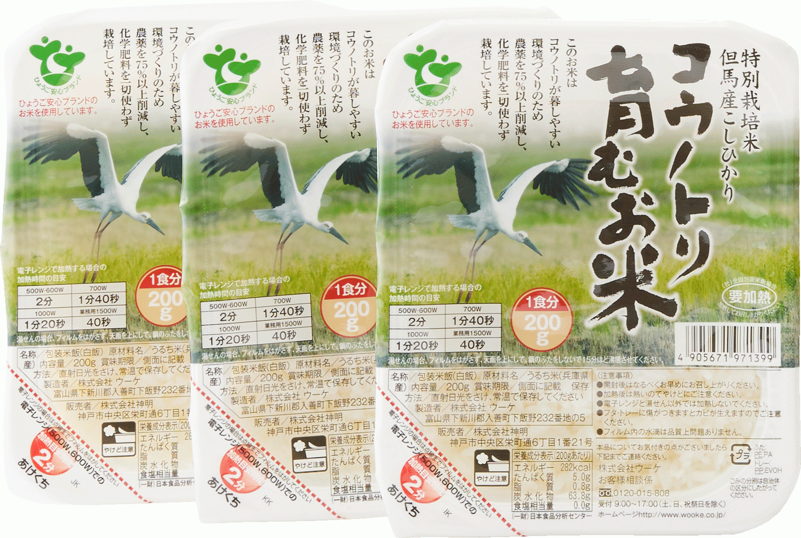 兵庫県但馬産の特別栽培米コシヒカリ「コウノトリ育むお米」のパックごはん。「コウノトリ育むお米」は、カエルやドジョウなど、コウノトリのエサとなる生き物が育つ環境づくりに取り組み、コウノトリの野生復帰を支える「コウノトリ育む農法」で栽培・収穫されています。できる限り自然のままを追求した安全・安心の田んぼで、生産者が愛情を注いだ人と自然に優しいお米です。