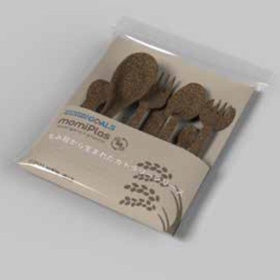 本来廃棄される予定だった兵庫県産米のもみ殻を配合して作ったカトラリーのセット。お米を生産する上で必ず発生し、廃棄せざるを得ないもみ殻の、全国排出量は年間約40万トンに及ぶと言われています。そのもみ殻を再利用することで、環境配慮に関する意識の醸成に繋げようと、JA全農兵庫・キリンビバレッジ株式会社 近畿圏統括本部が、独自の製造技術(フリーブレンド工法®)を所有する株式会社第一精工舎へ製造を依頼し、このカトラリーが誕生しました。