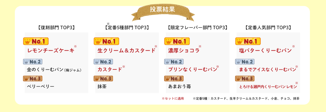 投票結果を元に、ランキング上位のくりーむパンを「#810感謝祭くりーむパンセット」としてお届けします。
