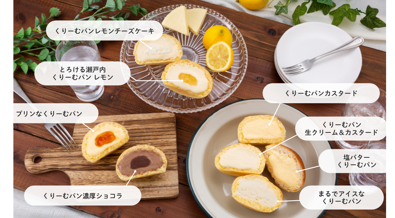 くりーむパン (カスタード・生クリーム&カスタード・ レモンチーズケーキ・塩バターくりーむパン×各2、 プリンなくりーむパン・濃厚ショコラ×各1)、 とろける瀬戸内くりーむパン(レモン)・ まるでアイスなくりーむパン×各1 |