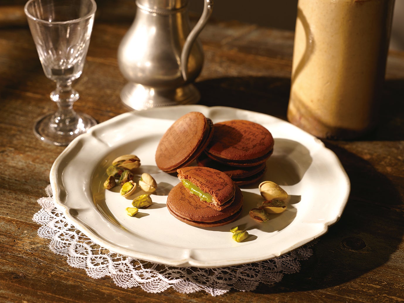 ピスタチオの風味が香る特製ソースを、ミルクチョコレートでコーティングし、ココアクッキーでサンドした、濃厚な味わいのサンドクッキーです。チョコレートとピスタチオ、2つの豊かな風味が織りなすハーモニーをお楽しみいただけます。