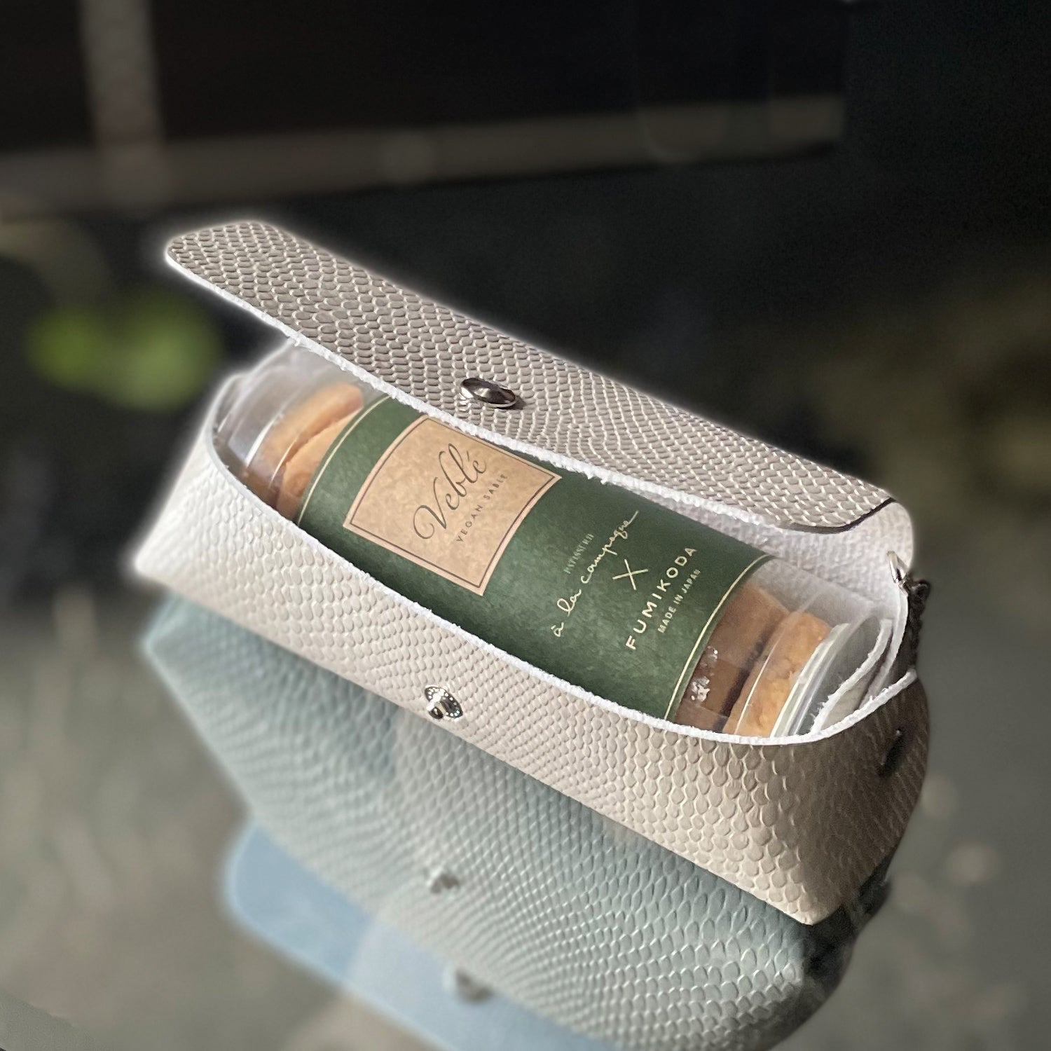パッケージはできるだけ廃棄を避けるためリユース可能なケースを採用。FUMIKODAのバッグの生産過程で余ったヴィーガンレザーをアップサイクルして制作しています。「Veblé」(ヴィブレー)を召し上がった後にもメガネケースやメイクポーチとしてもリユースいただけます。