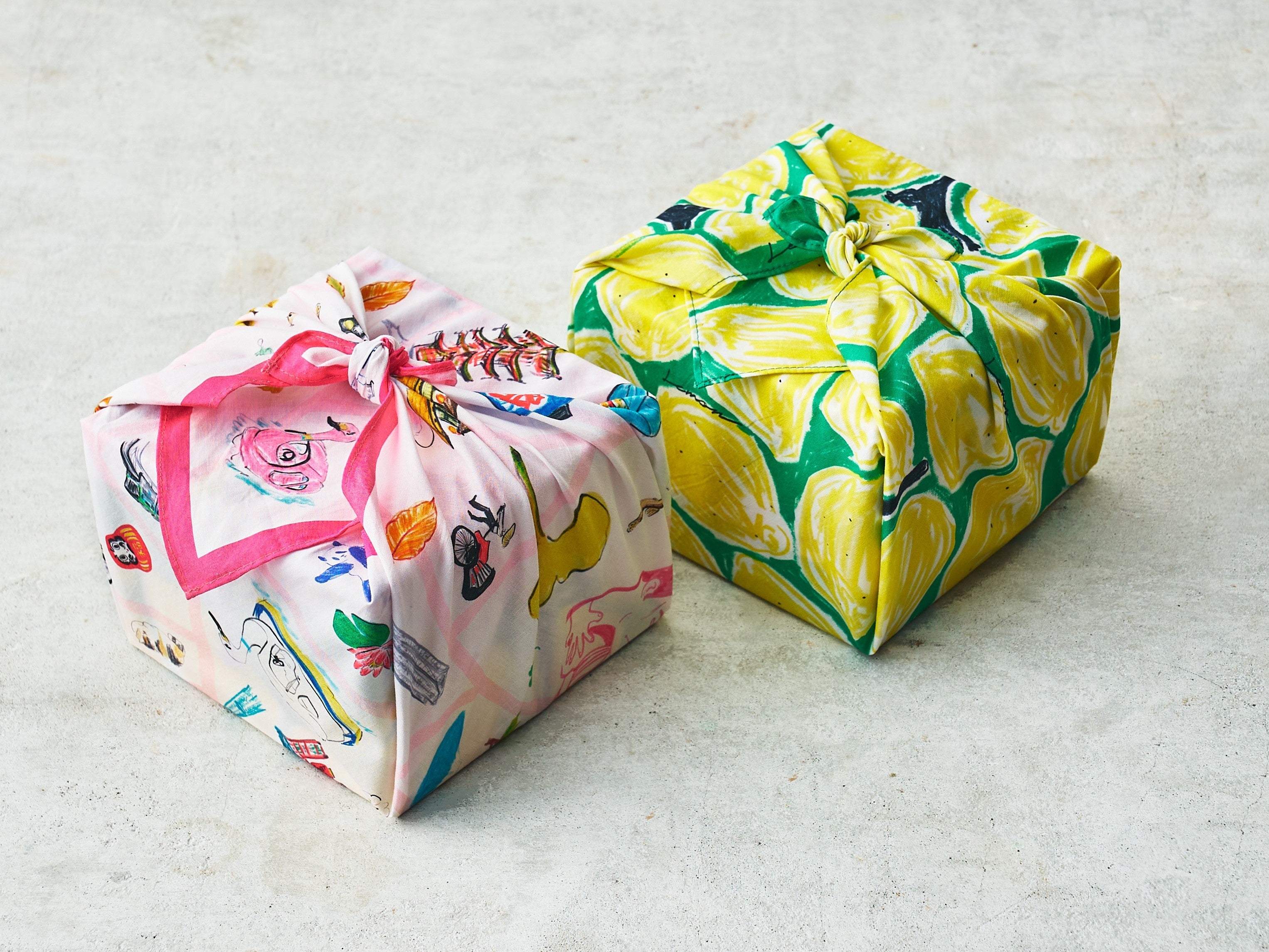 人気イラストレーター佐伯ゆう子さんにデザインを描き下ろしていただいたバンダナで風呂敷のように包んでお届け。